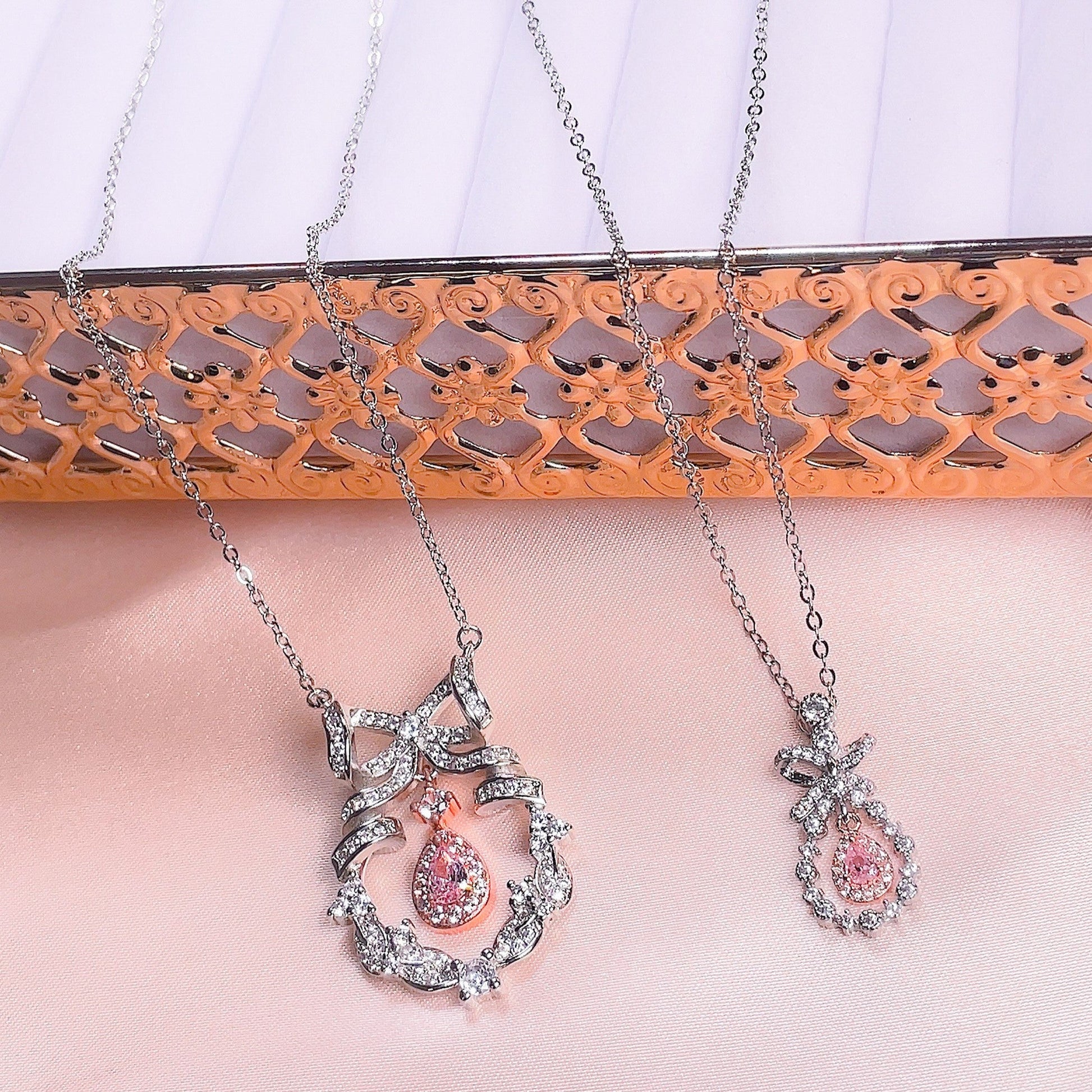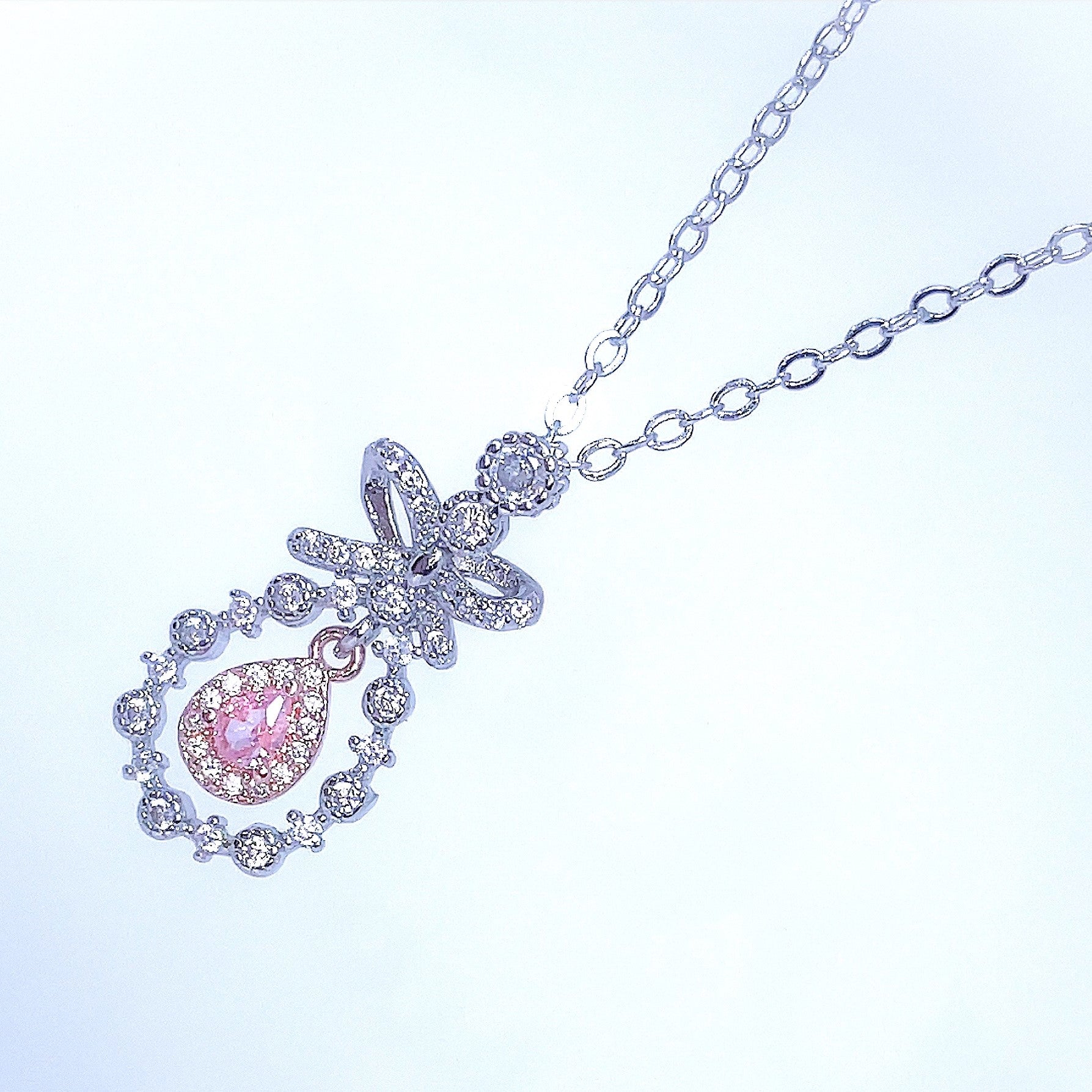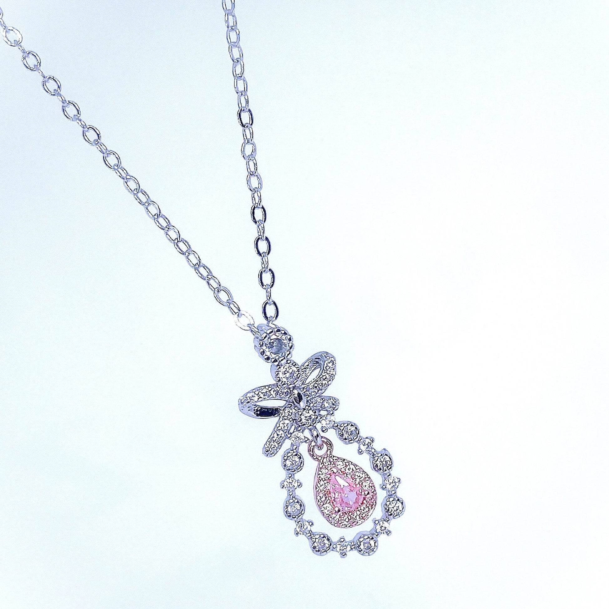Uroczy kwiatowy naszyjnik z zawieszką w kształcie łezki i wiankiem z kokardą, pełen księżniczkowego klimatu! Dostępny w małej i delikatnej wersji oraz dużym, efektownym naszyjniku.