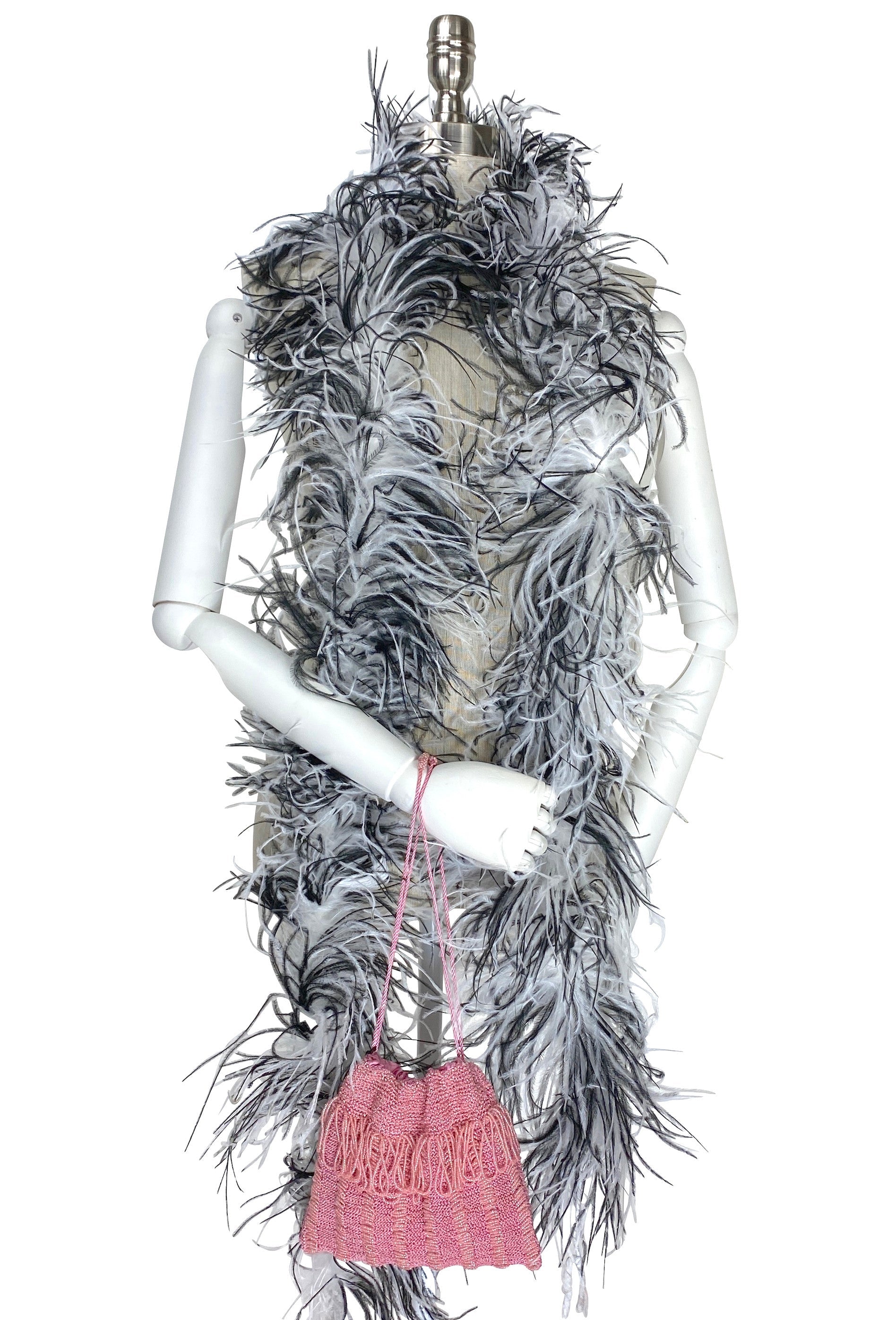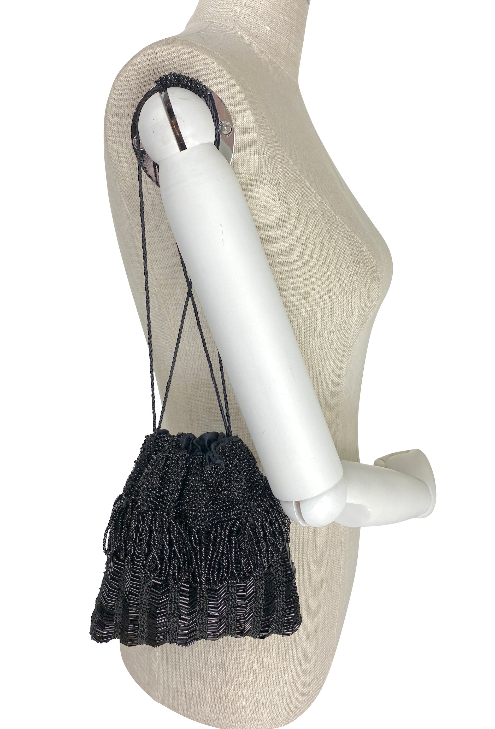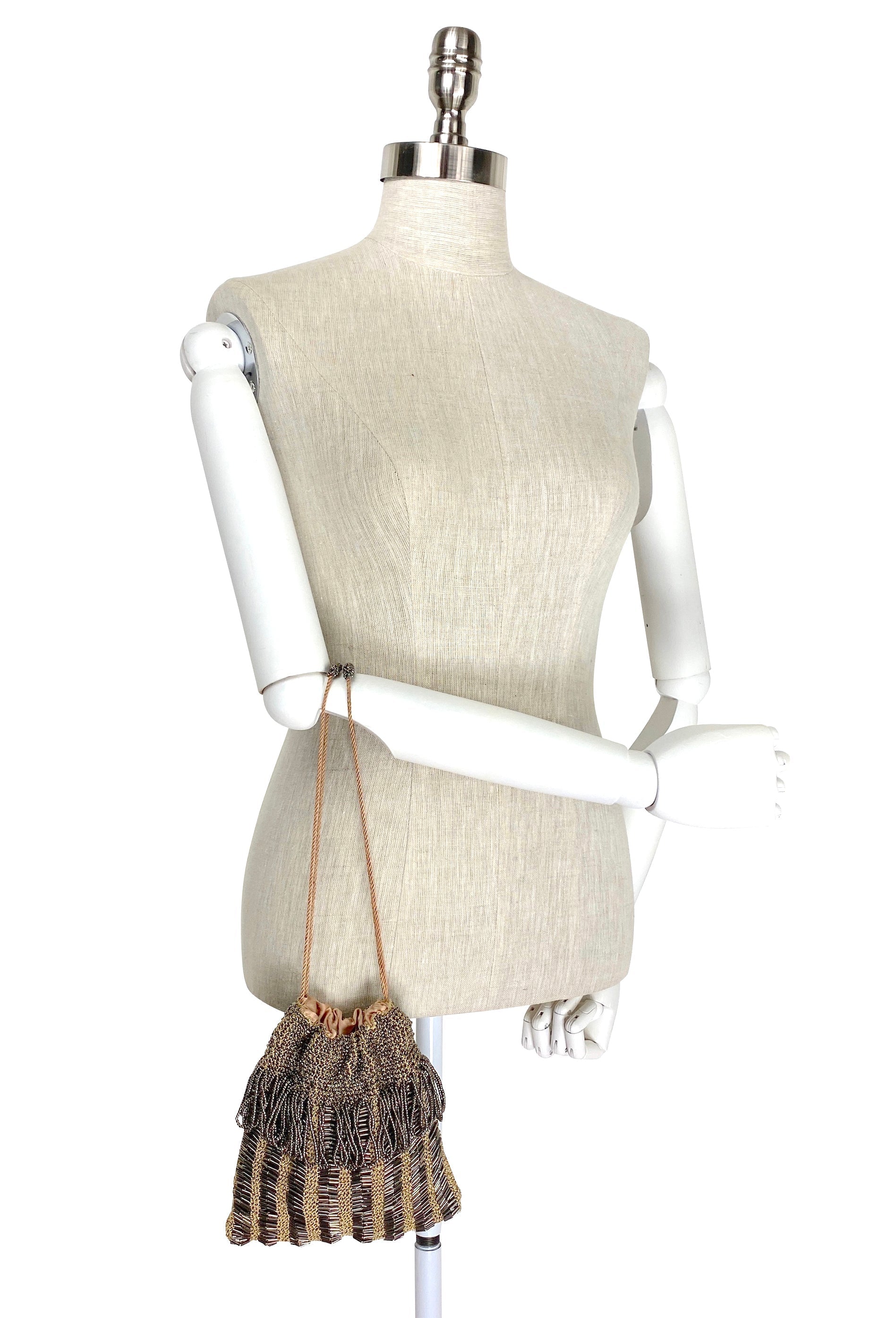 Mignon Pochette ma szydełkową podstawę ozdobioną dekoracyjnym wzorem z koralików i pętelkowym frędzlem. W pełni podszyta satyną z jedwabnymi paskami. Koralikowe akcenty na paskach dla dodatkowej jakości dziedzictwa.