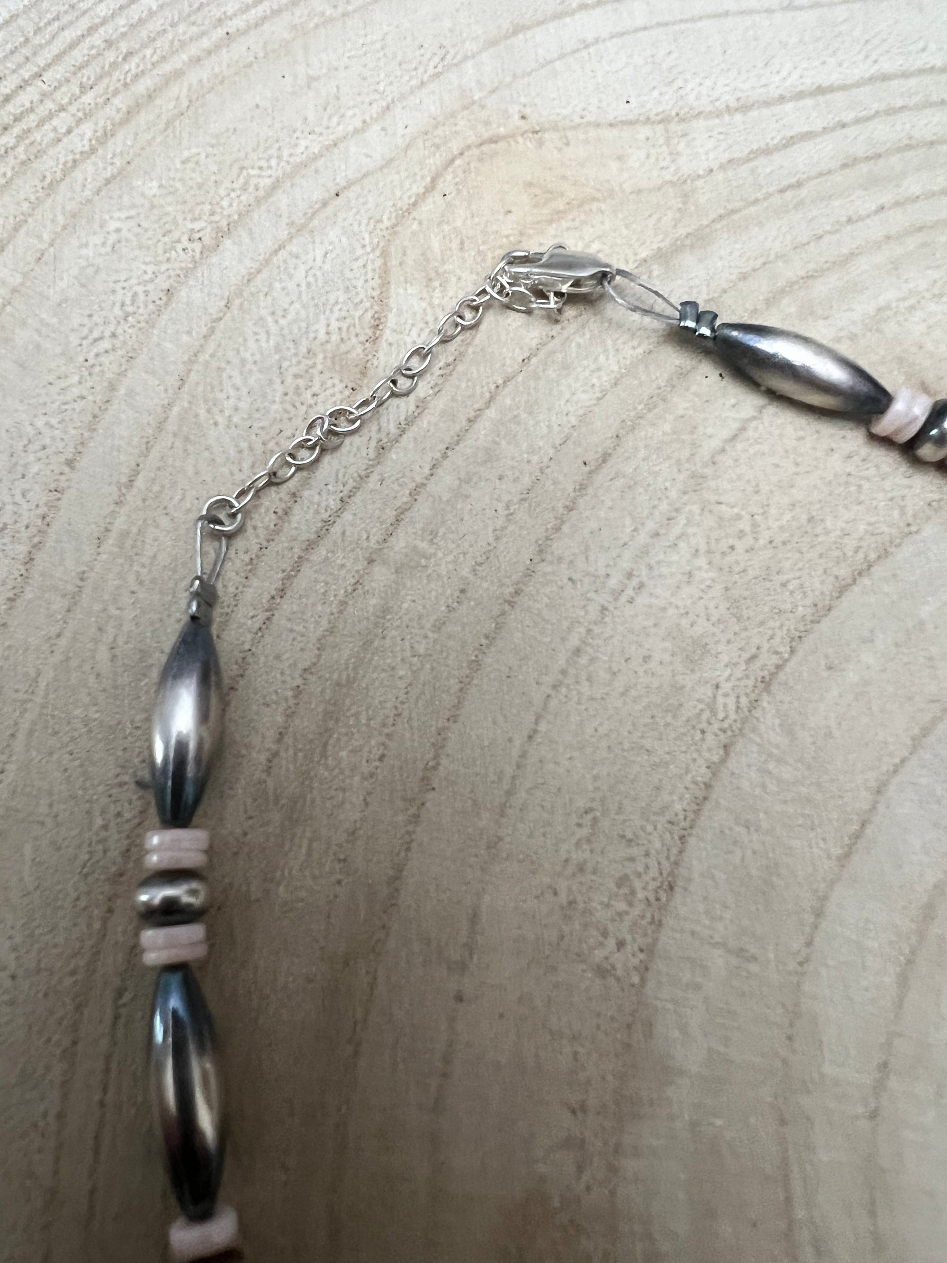 Ta obroża o długości 14 cali + 3 cale przedłużki zawiera perły torpedowe ze srebra sterling o wymiarach 5x15 mm, perły ze srebra sterling w kształcie spodka o średnicy 5 mm oraz akcent z różowego koncha. Każdy egzemplarz jest nieco unikalny. Zawiera łańcuszek przedłużający o długości 3 cali dla dodatkowej personalizacji.