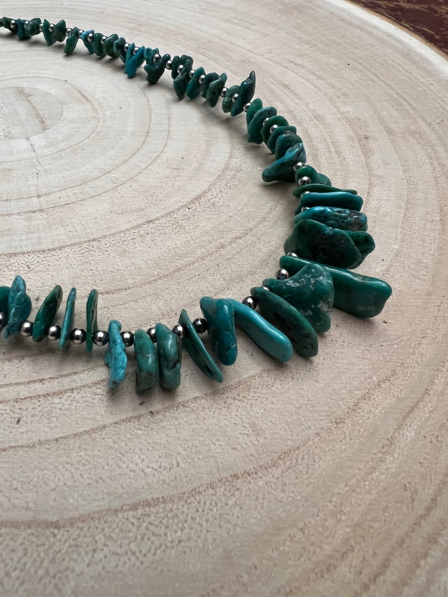 Rozkoszuj się tym niesamowitym naszyjnikiem! Amerykański turkus połączony z perłami ze srebra próby 925 o średnicy 3 mm, tworząc unikalny i wszechstronny naszyjnik o długości 18 cali. Każdy ręcznie wykonany egzemplarz jest niepowtarzalny, różni się rozmiarem i kolorem. Uzupełnij wygląd zardzewiałym zapięciem na hak. Idealny na każdą okazję, od ślubów po modę westernową, ta autentyczna i starannie wykonana biżuteria to doskonały dodatek do każdej kolekcji.