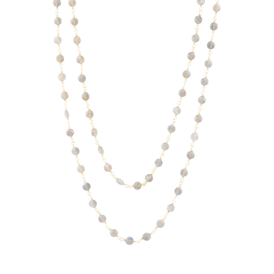 Dodaj kolorowy akcent do swojej garderoby dzięki naszemu naszyjnikowi z prawdziwego mosiądzu pozłacanego i labradorytu! Dwa rzędy różańcowo połączonych fasetowanych labradorytów tworzą unikalny element, który z pewnością przyciągnie uwagę, ważąc jedynie 25,6 grama. Wewnętrzna warstwa ma 35", a zewnętrzna 37". Z 2-calowym łańcuszkiem przedłużającym i zapięciem typu karabińczyk, można go łatwo dopasować do idealnego rozmiaru.🌟