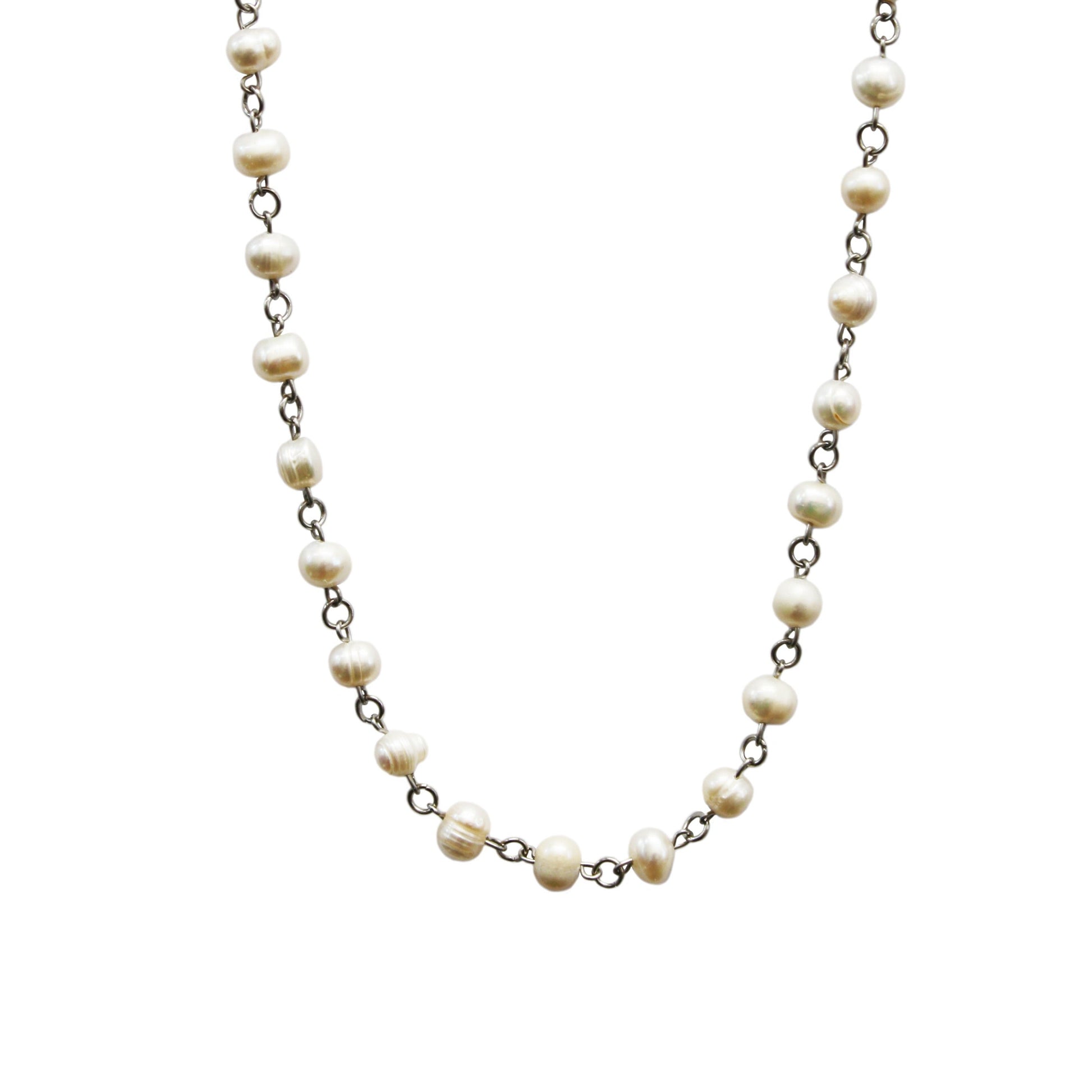 Ręcznie wykonane z połączonych białych pereł słodkowodnych. Ten uniseksowy styl jest idealny samodzielnie lub w warstwach z jednym z naszych naszyjników z zawieszkami.