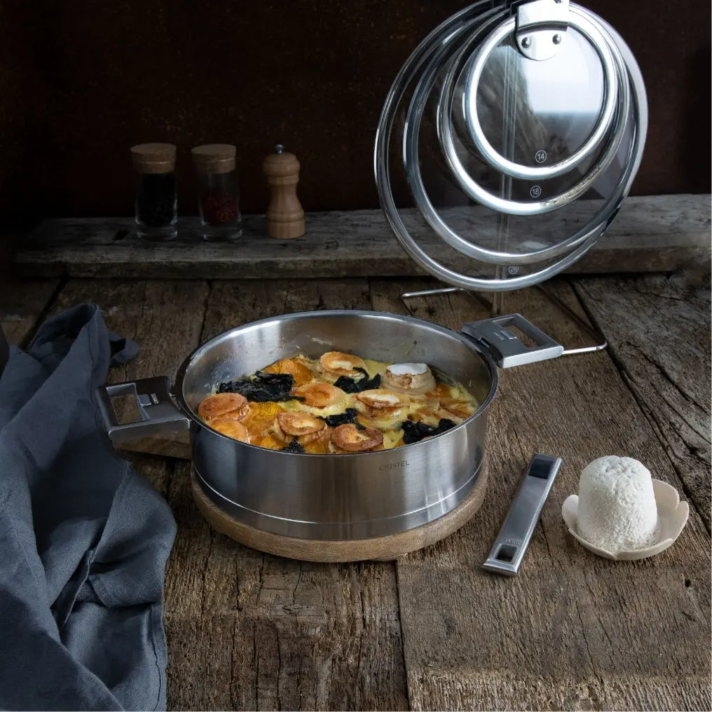 Thanks to the efficiency of their CRISTEL® L Shape thermo-diffuser base, compatible with induction, the Strate®Detachable handle system fits all kitchen sizes and will be a valuable ally for all your culinary preparations. Practical, the detachable handle system makes it possible to transform your stainless steel vessel into a serving dish by replacing the long handle with short handles.