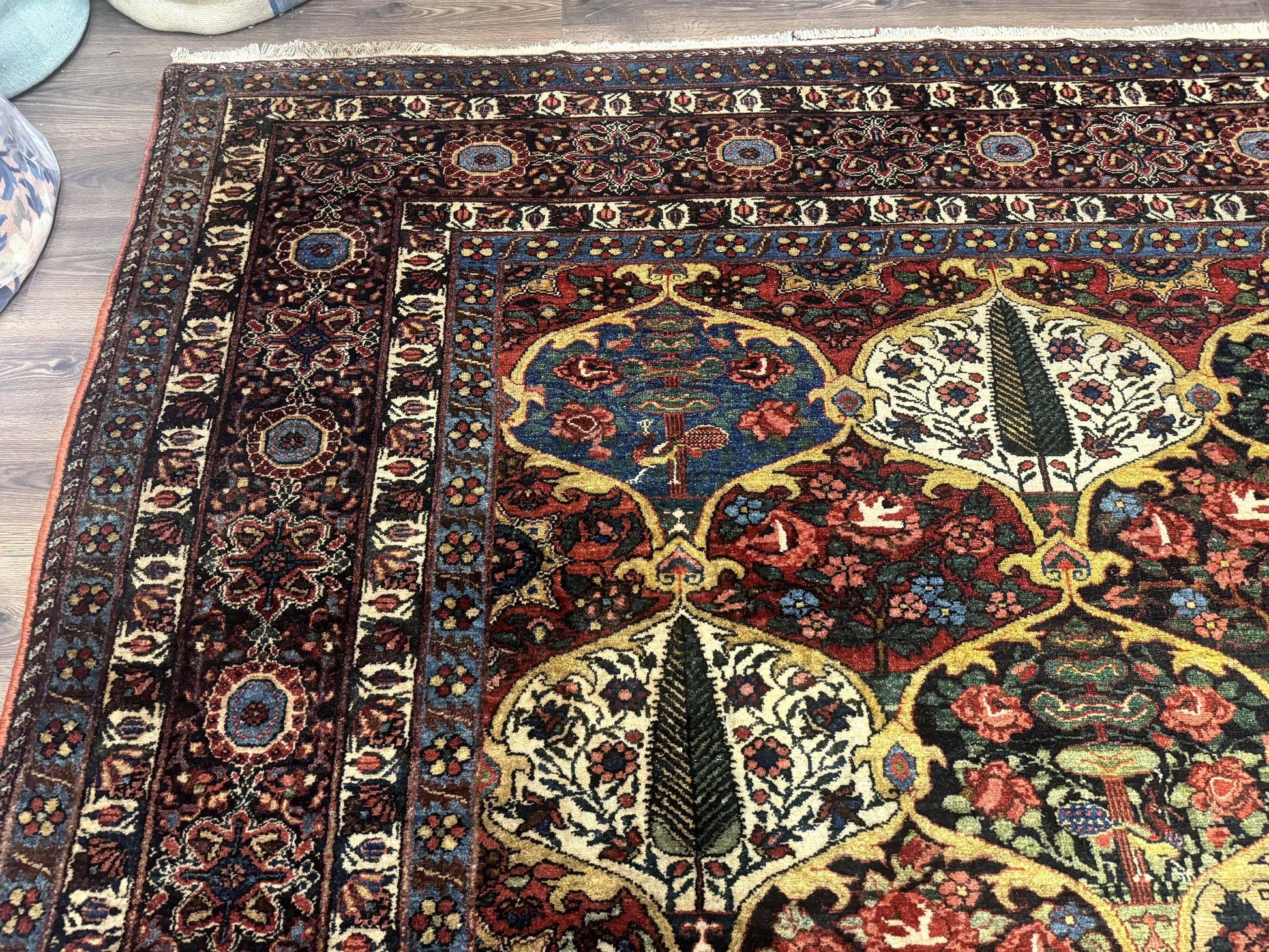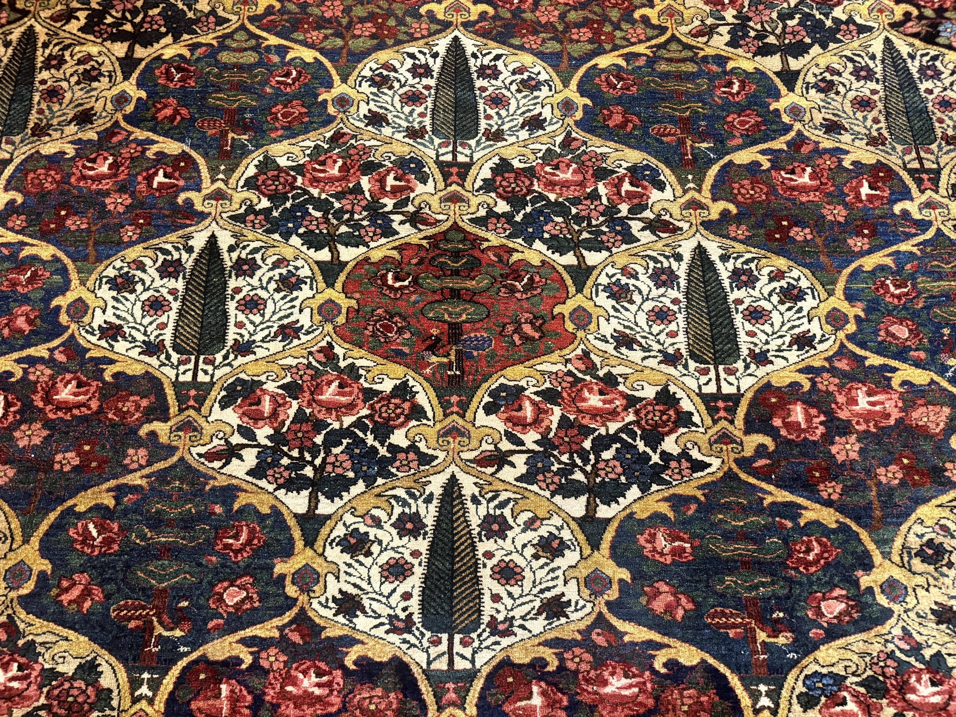 This oversized Bakhtiari rug showcases a rare and elaborate panel design featuring peacocks and stylized florals—a motif often associated with nobility and protection. The cypress trees, symbolizing eternity, are carefully framed in a latticework of medallions. Its scale, rich coloration, and exceptional preservation make it a standout piece for collectors and designers alike.
