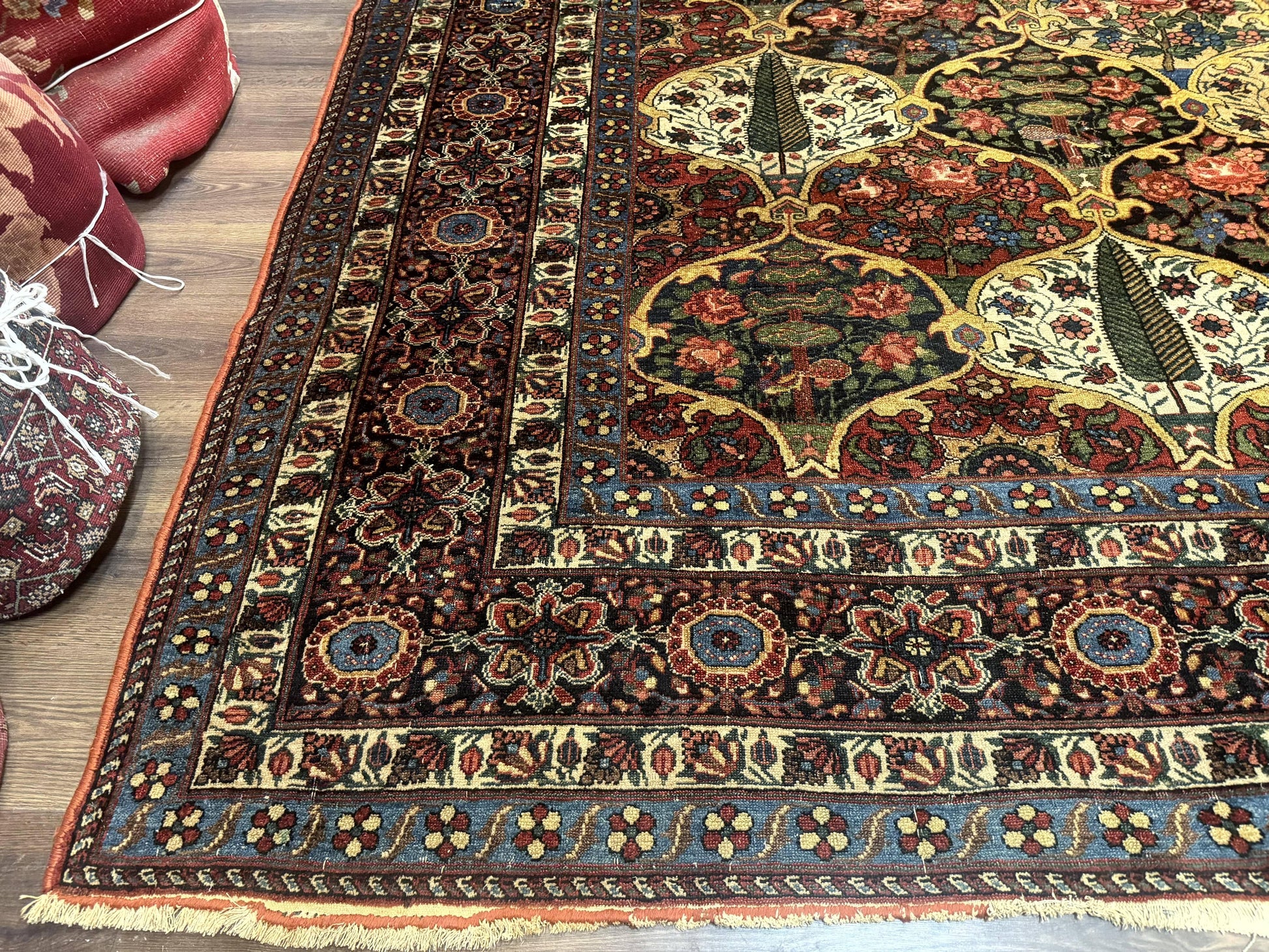 Bakhtiari rugs originate from the Bakhtiari tribes of southwestern Iran, particularly near the Zagros Mountains. These rugs are celebrated for their durable construction, bold geometric or garden-themed layouts, and use of natural dyes. One of the most recognizable formats is the paneled “khesti” design, where individual compartments contain floral or tree-of-life motifs—symbolizing paradise. Woven by both nomadic and settled communities, antique Bakhtiari rugs are prized for their high-quality wool and regional variations in pattern.