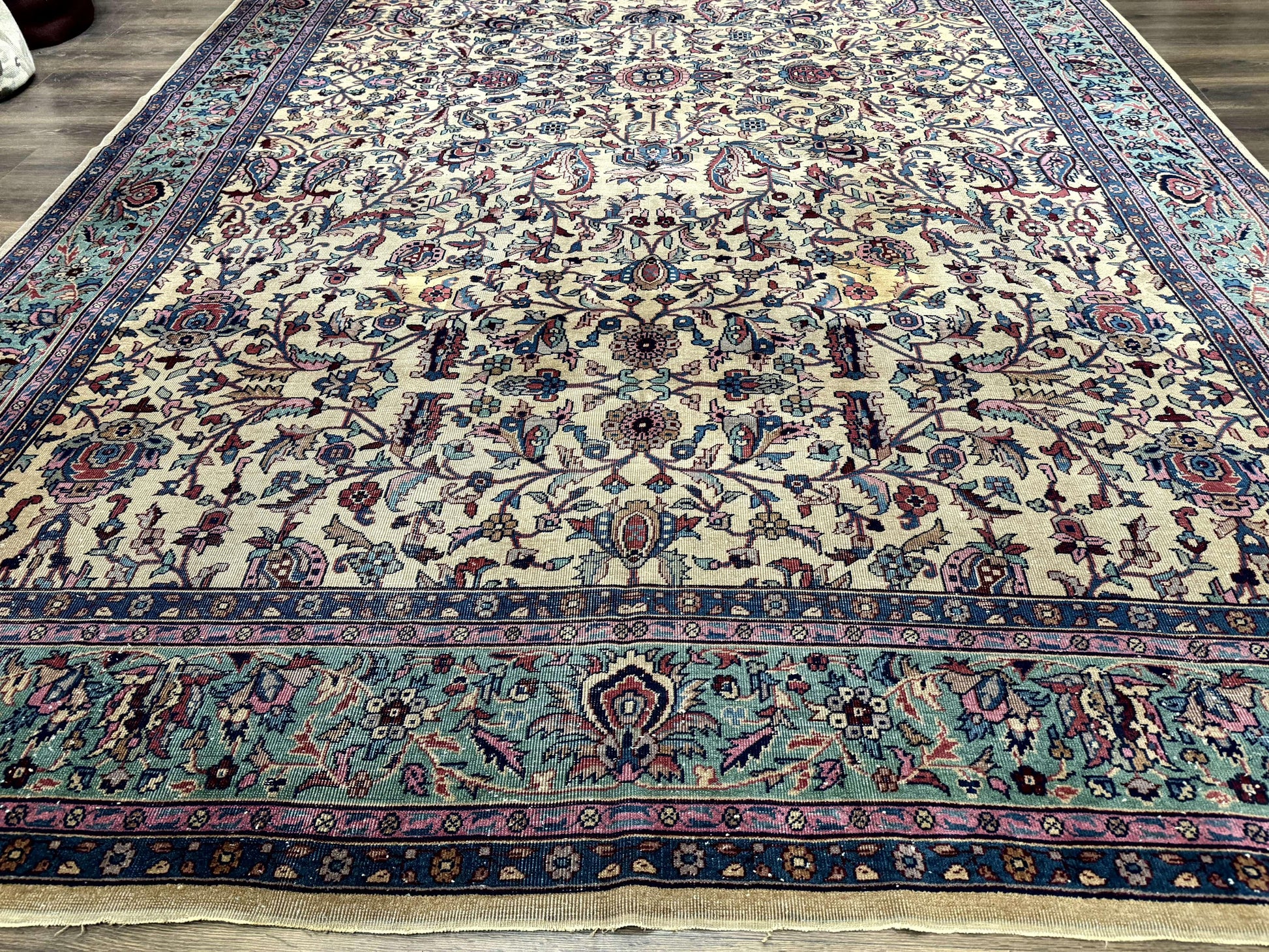 Antique Persian Rug 10x15, Camel and Cyan, Allover Pattern, Rare, Samarkand Rug