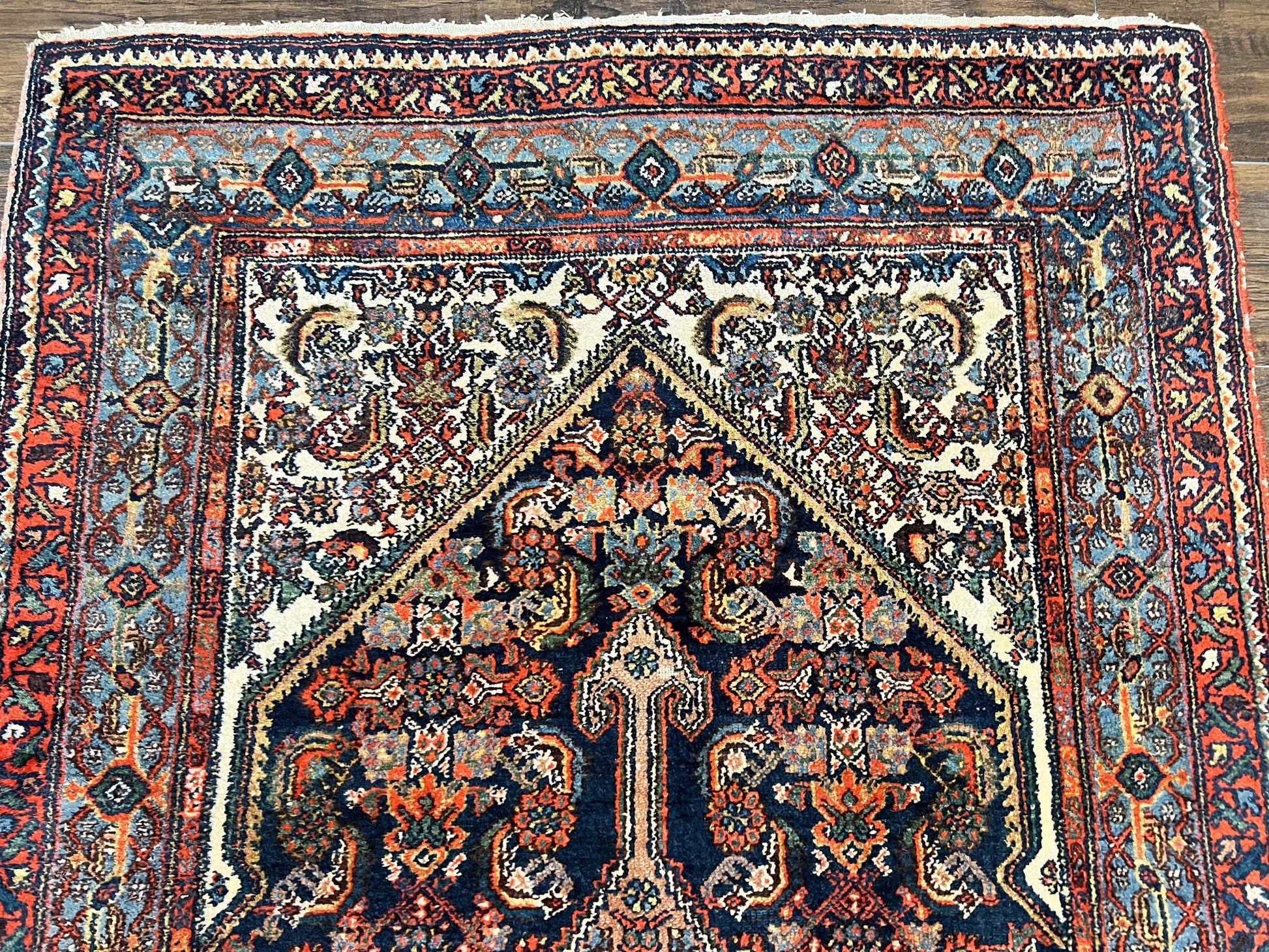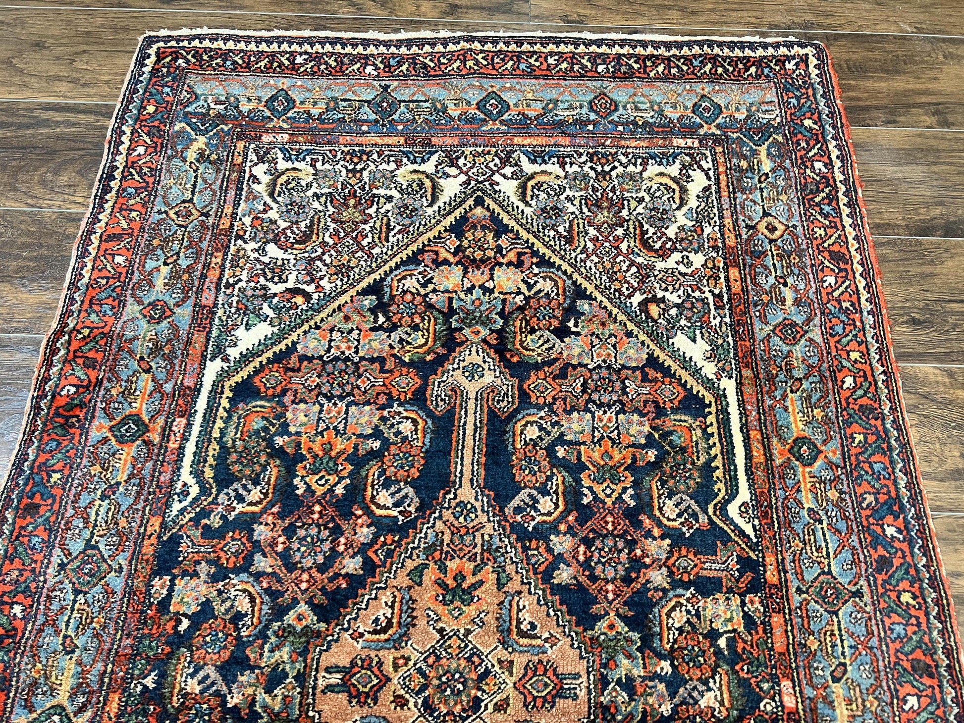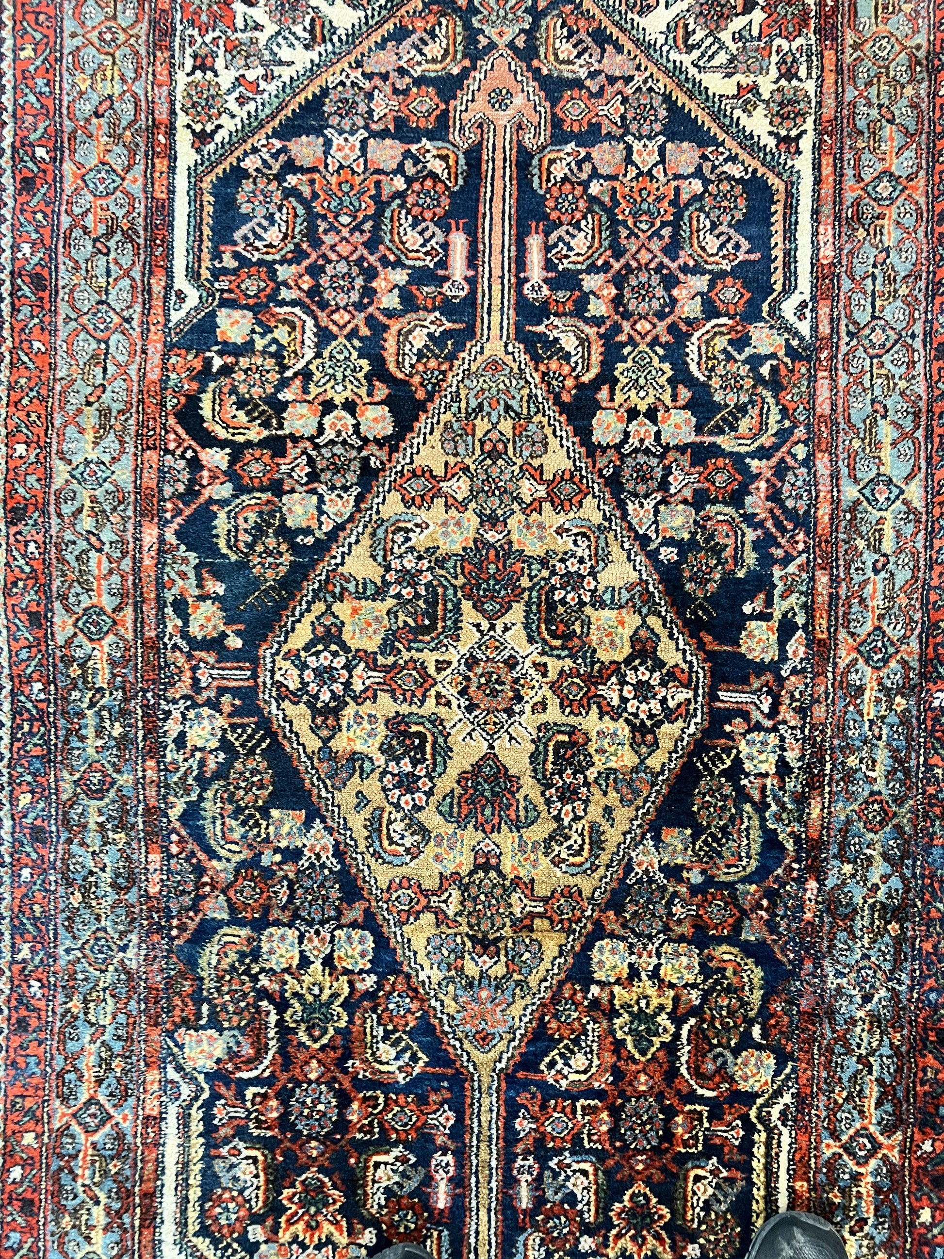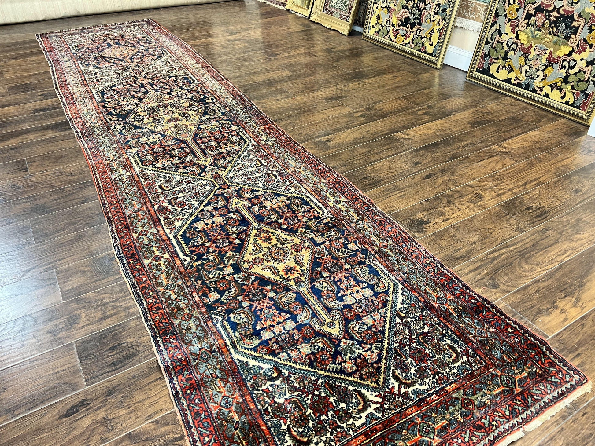 Antique Persian Runner Rug 3.7 x 15.8, Navy Blue Multicolor, Hand Knotted Handmade Wool Rug for Hallway, Geometric Medallions, Persian Hamadan Rug