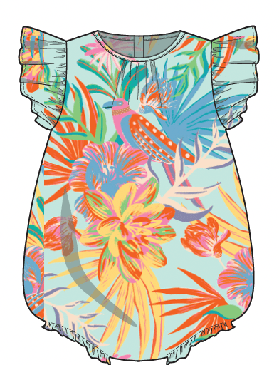 Introducing the Baby Brianna Bubble! This adorable onesie features playful ruffle details at the sleeves and legs. The colorful tropical print will have your little one looking cute and ready for a day of fun in the sun. Perfect for capturing those memorable moments!