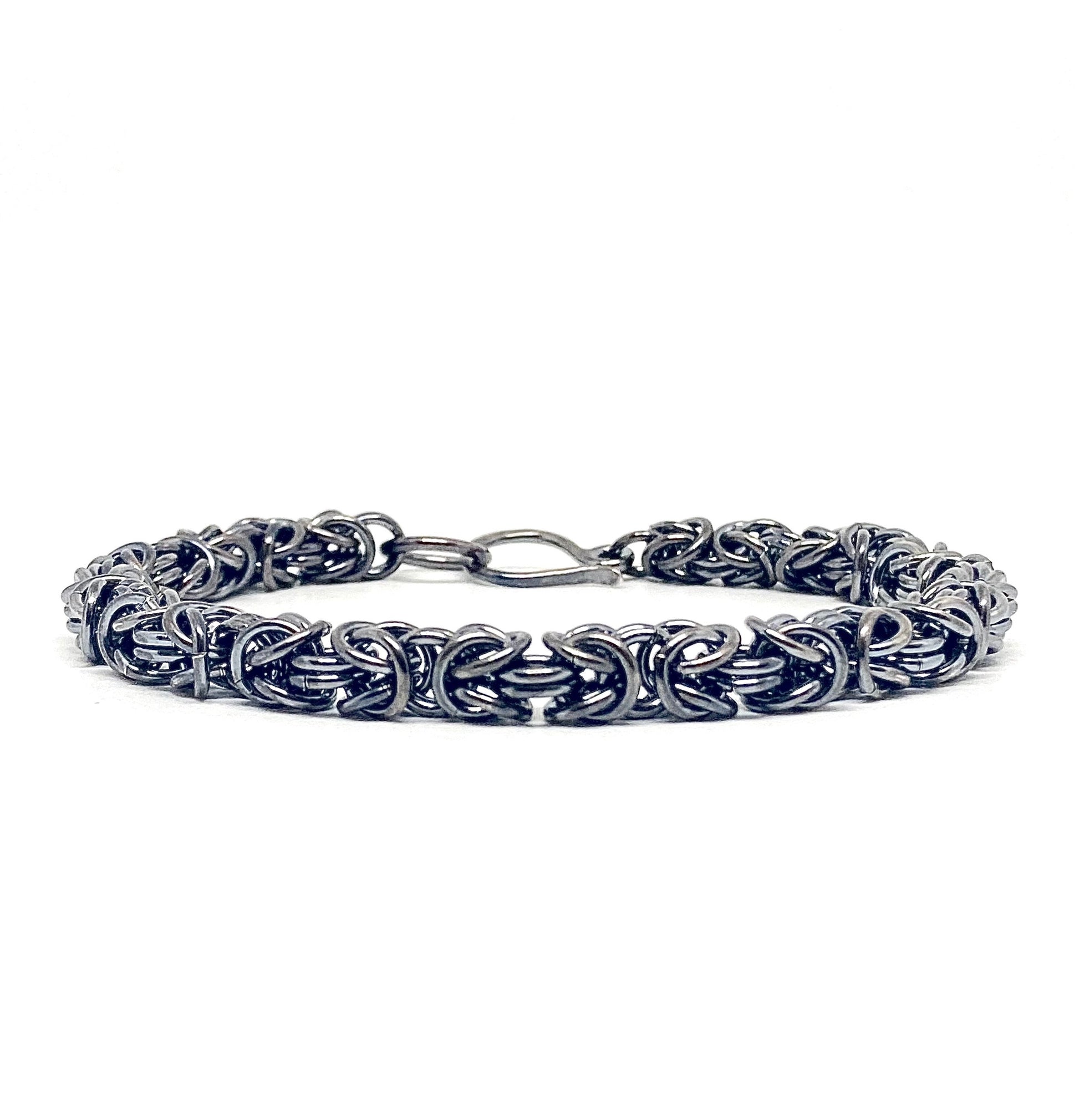 Byzantine is one of the oldest chainmaille designs in history, thought to date back to ~300 BC. Similar to Box Chain, this bracelet is both beautiful and bold. This bracelet was entirely handmade - from each individual ring to the forged hook clasp. After creating the rings from wire in our studio, they are carefully connected link by link. Strong enough for daily wear, this piece is also stunning to wear for special occasions.