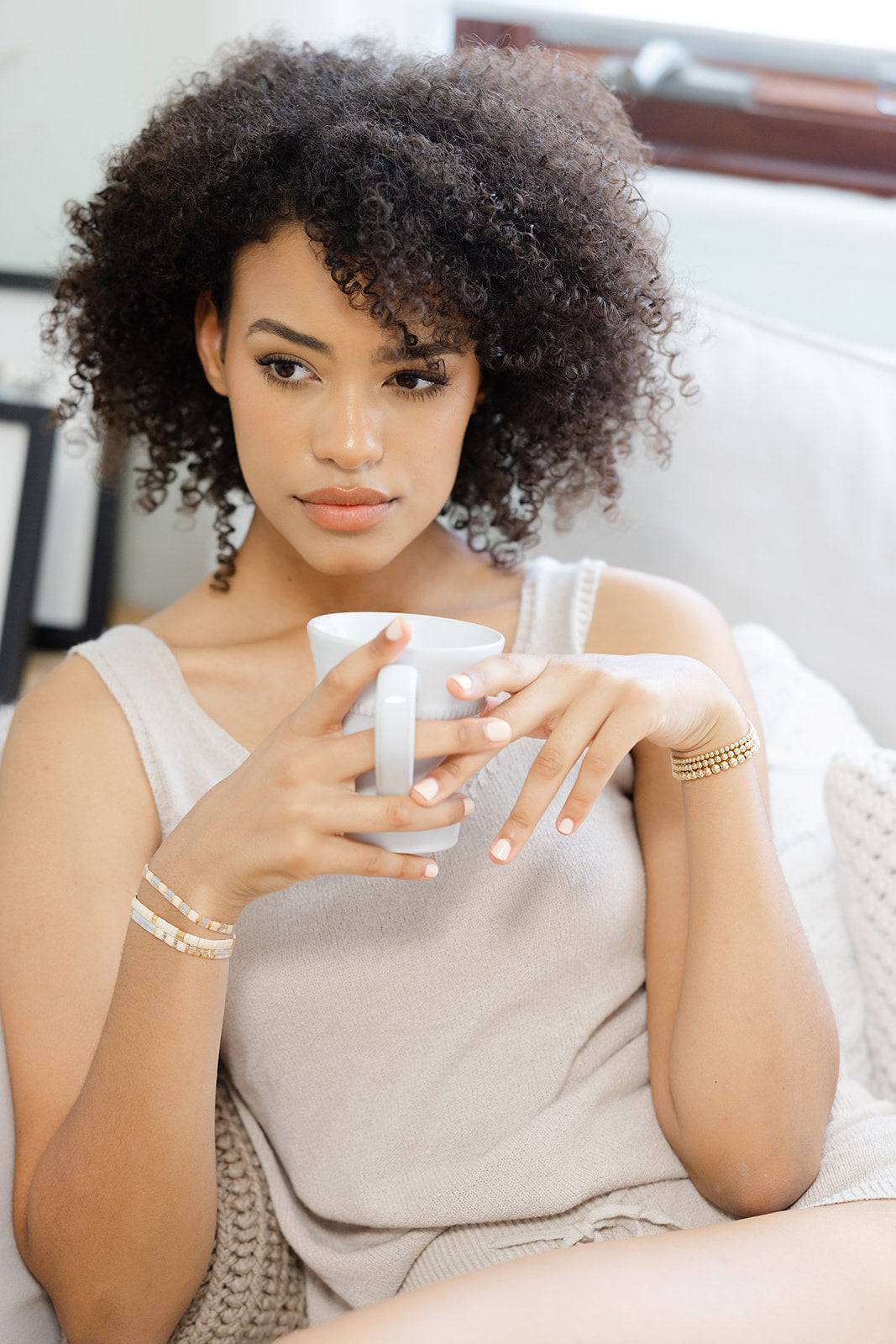Expertly designed and crafted, the Coconut Tila Bracelet features a stunning combination of ivory and gold Miyuki Tila beads. Handcrafted in the USA by a skilled Coast and Cove Artist, each bracelet is approximately 6.5 inches and designed with a unique pattern that sets it apart from the rest. With a stretch bracelet design, it's easy to wear and perfect for any occasion.
