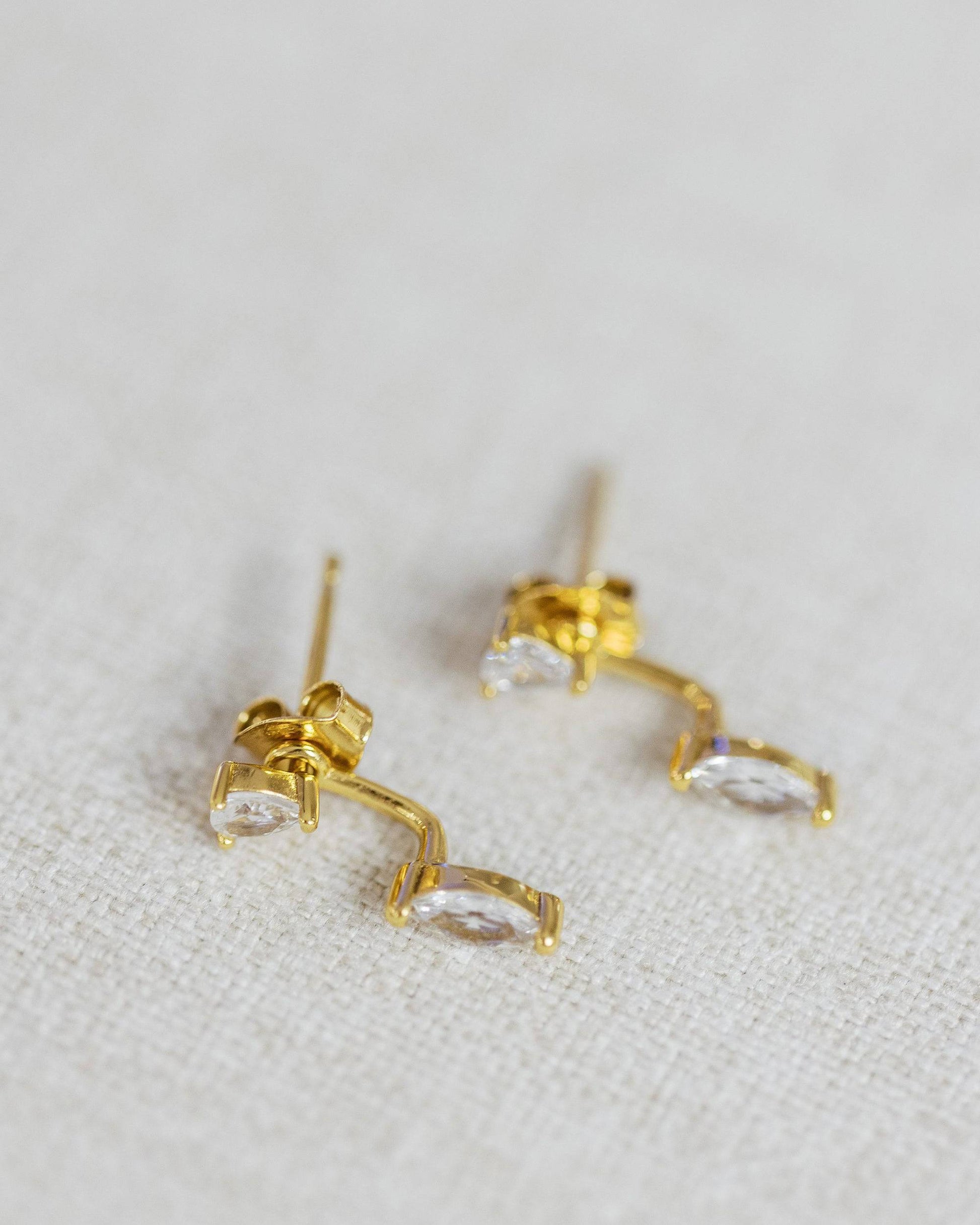 Our Crystal Jacket Studs feature two crystal studs that create an eye-catching, statement-making look. One crystal is placed above the ear for a modern touch, and the other behind the ear for a unique style. These have quickly become a Coast + Cove favorite.