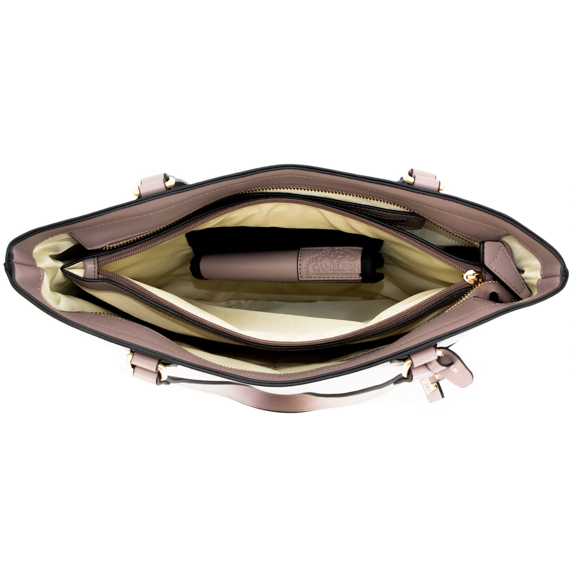 The CCW compartment is located in the center of the bag that is accessed from a top zipper. The CCW pocket is padded on both sides with one side lined with hook-and-loop fastening. Included with Evelyn is a matching holster with hook-and-loop fastening on either side for easy personalized placement within the CCW pocket.