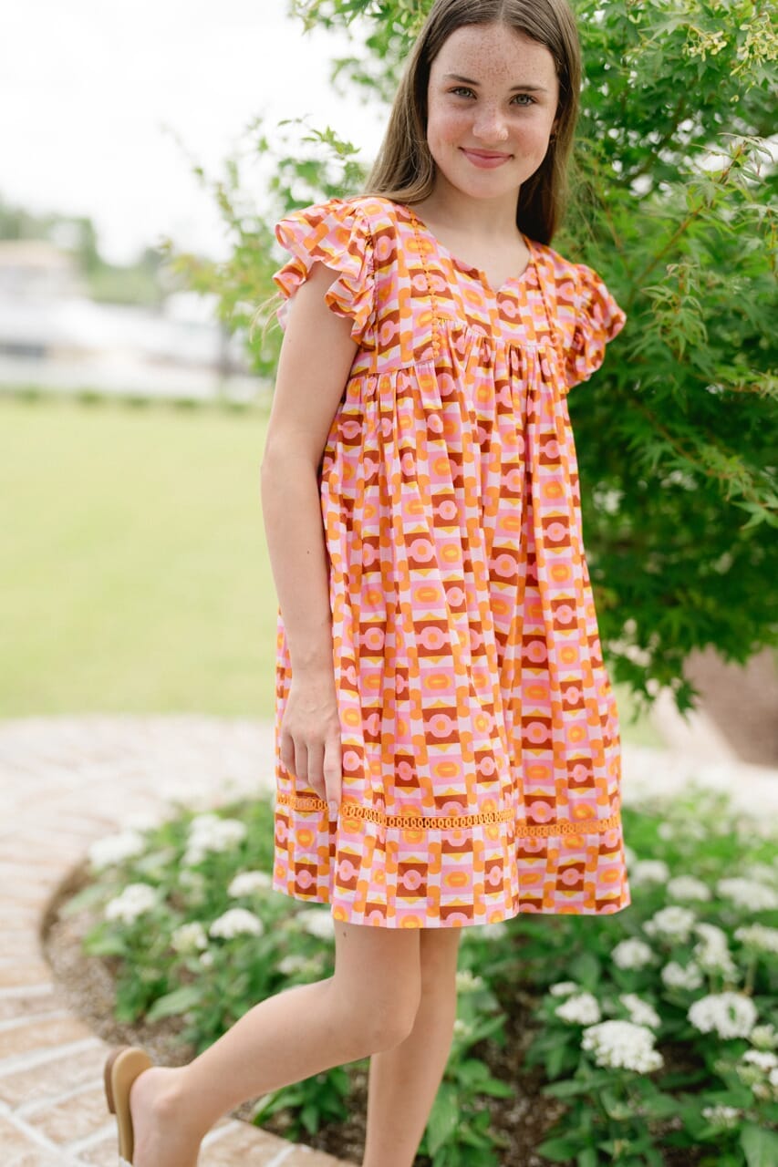 Brighten up your little one's wardrobe with the Girls Ellen Dress. The playful geometric print in pink, orange, and yellow is sure to make a statement, while the flutter sleeves and trim detail add a fun and stylish touch. Perfect for any occasion, this dress will have your little girl looking and feeling her best!