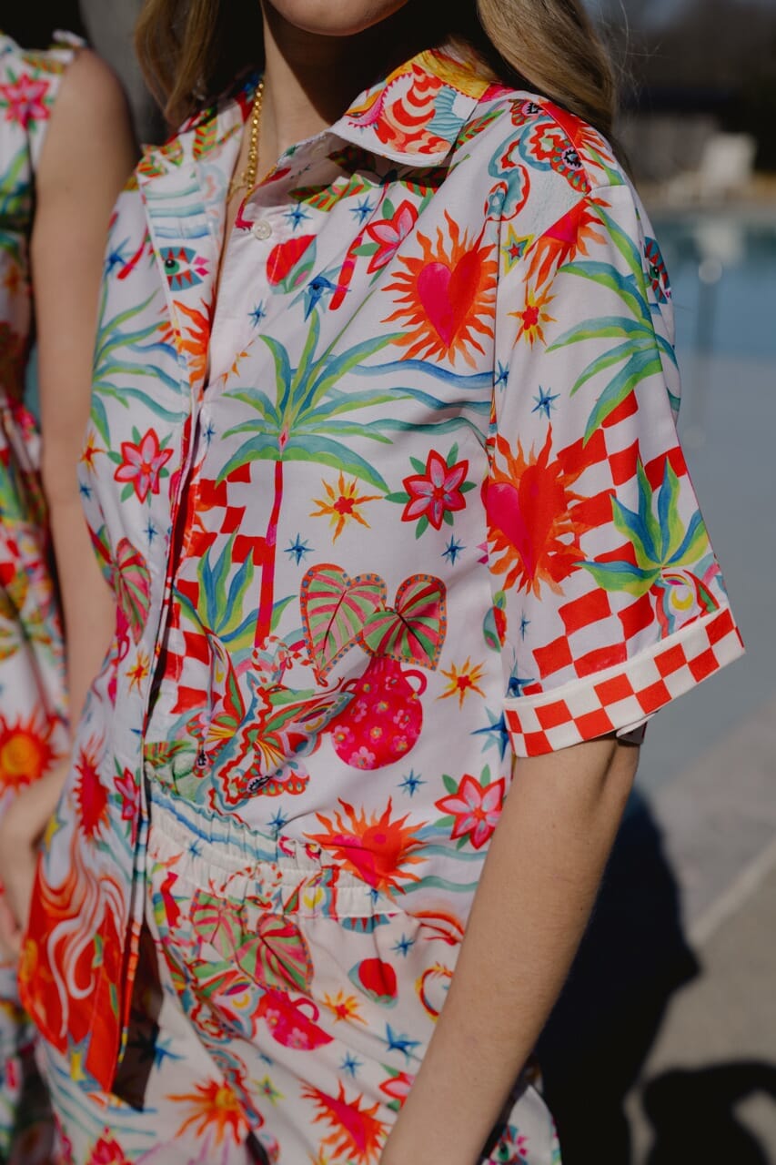 Ride the waves of style with the Joanna Top! This short sleeve button front shirt boasts a vibrant tropical print, accentuated by checkered trim detailing. Beach days or brunch dates, this top has got you covered. Catch some compliments in the Joanna Top!