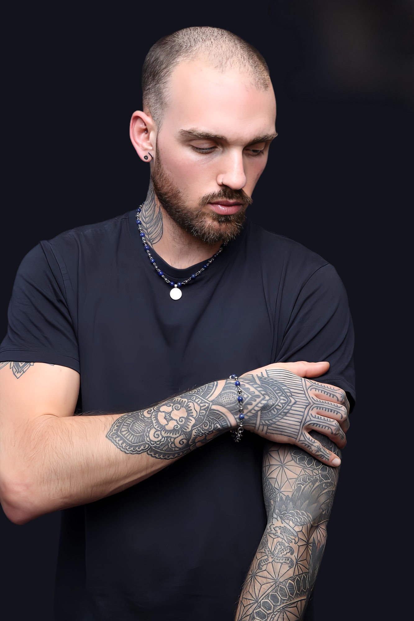Crafted from linked Lapis Lazuli gemstones gemstones and silver coin pendant.