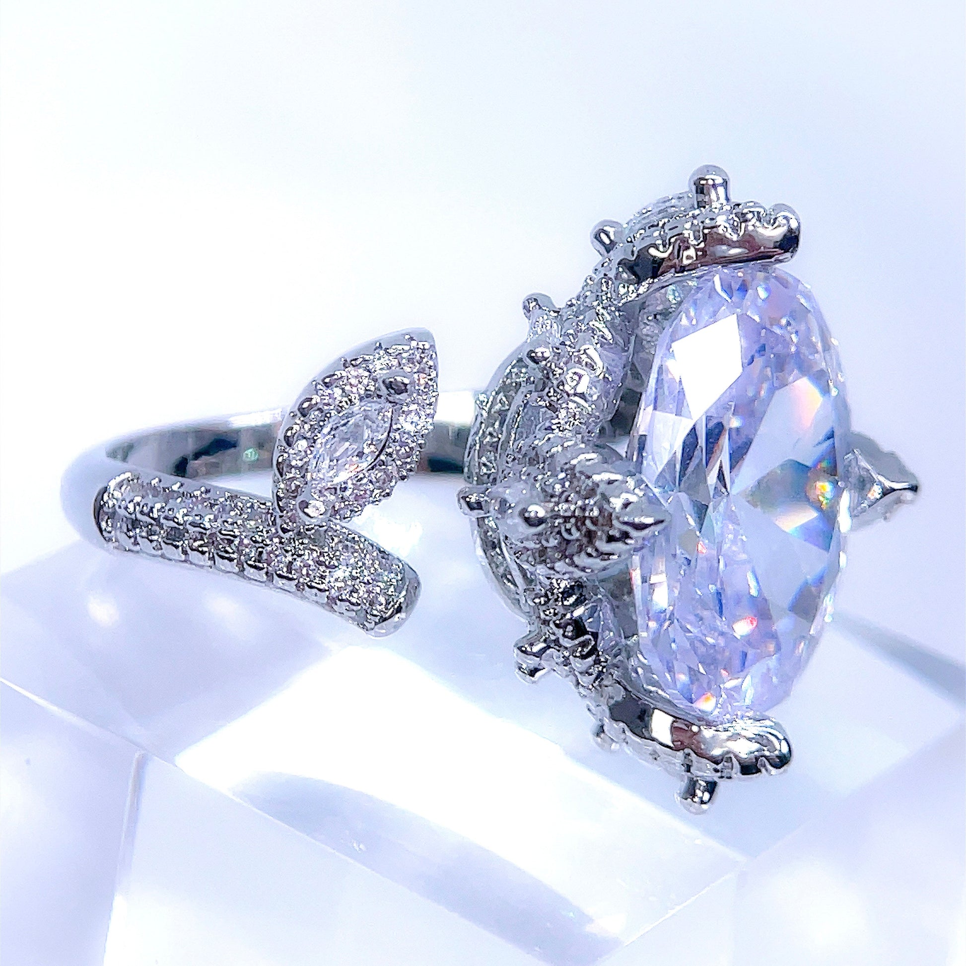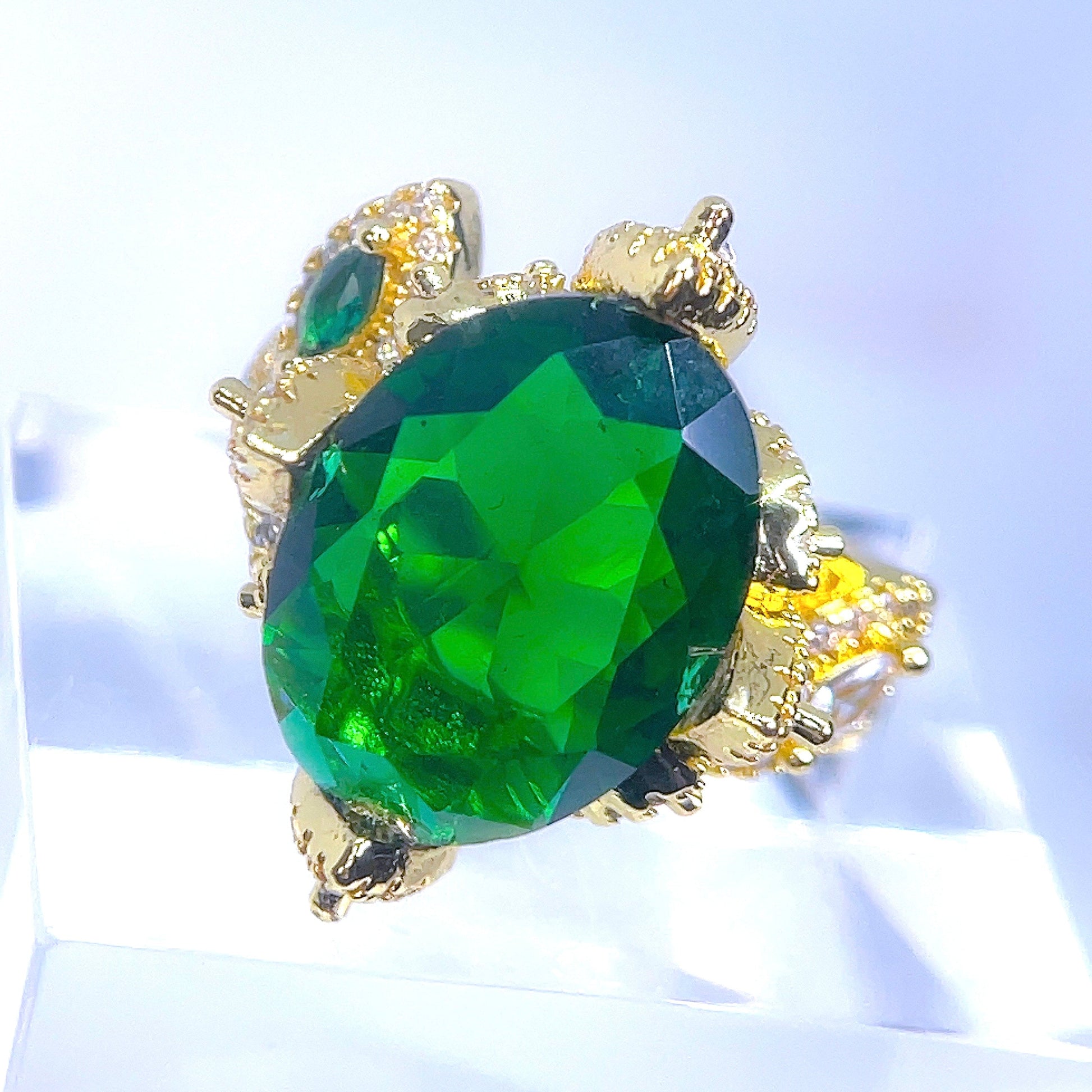 A bold statement ring that embodies power and magnificence. Using quality crystals, the shine is on the level of a diamond. Available in emerald green, tourmaline pink, sapphire blue, and clear diamond.