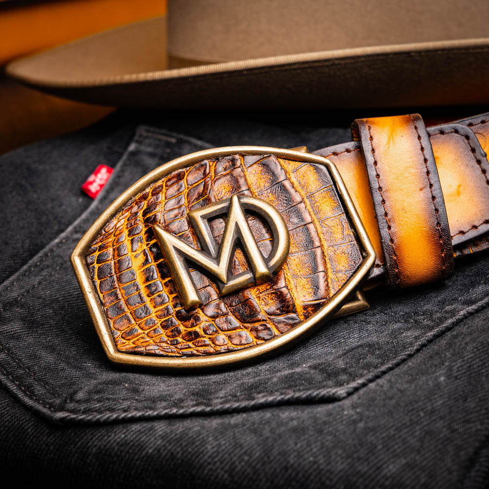 The MONTANA belt channels classic Western spirit through a bold, handcrafted lens. Made from genuine caiman crocodile skin and overlaid with rich full-grain calf leather, it features the distinctive Marco Di Milano brand stamp across the outer panel and a custom center-stitched leather channel—a nod to traditional saddlework that adds both texture and character.