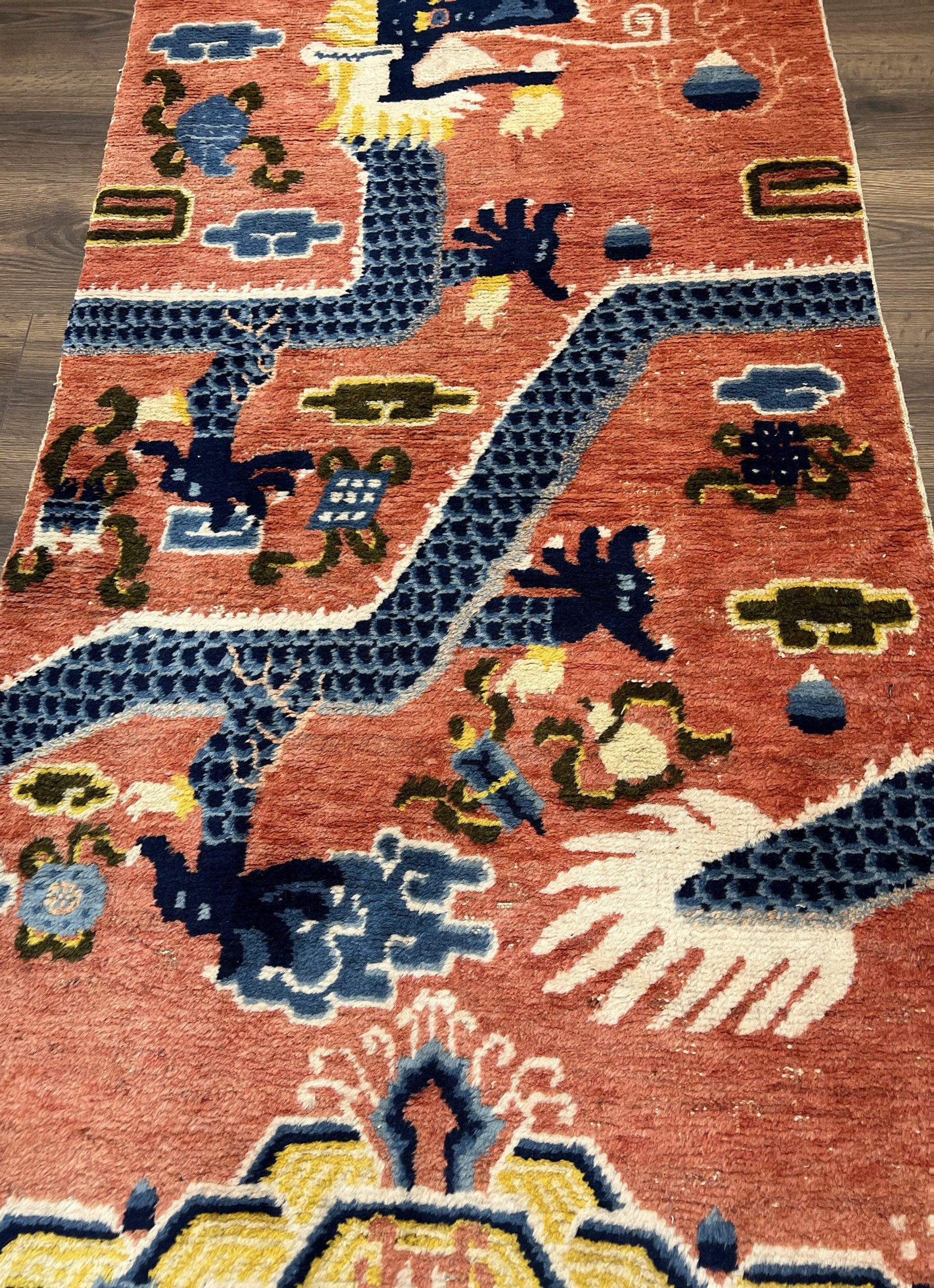Rare Chinese Ningxia Pillar Rug 3x8, Late Qing Dynasty, 5 Clawed Dragon, Cloud Rainbow Border, Collectible Antique Carpet, Wool Hand Knotted