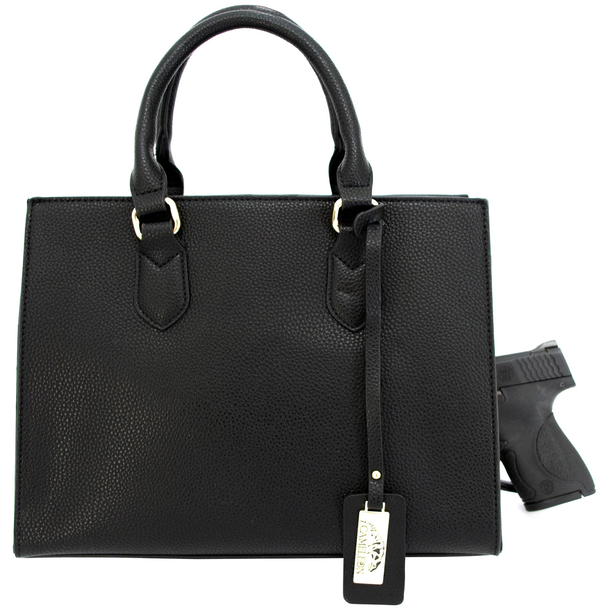 The concealed carry pocket is located on the back of the bag with access from either side of the purse. The compartment is padded with hook-and-loop fastener lining on the outer side for maximum comfortability. A padded holster with a hook-and-loop fastener on both sides is included to allow you to personalize the placement of your firearm.
