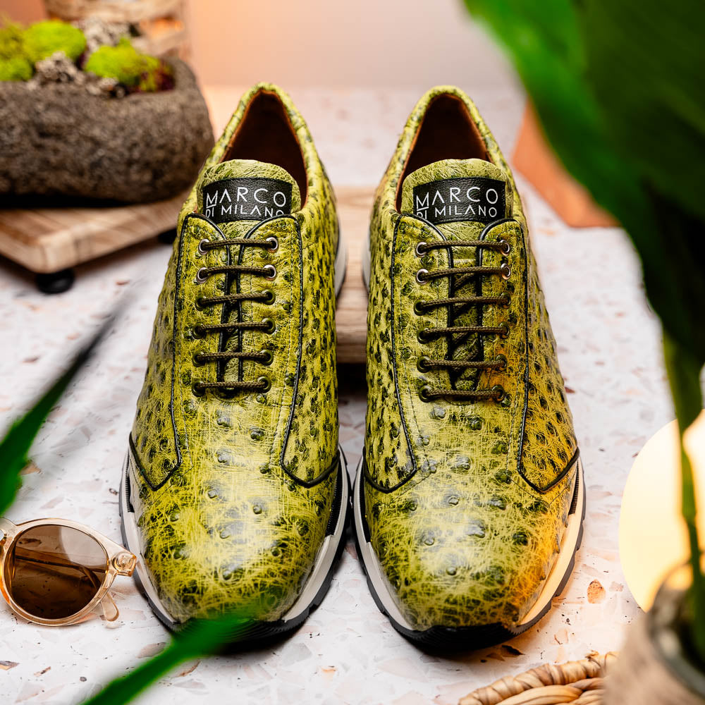 The SCANNO is our classic genuine ostrich quill fashion sneaker boasting a sporty uptempo silhouette and hand painted finish. Dress these up with your favorite slacks for a sporty dress look or pair them with jeans or shorts for a casual but clean look.