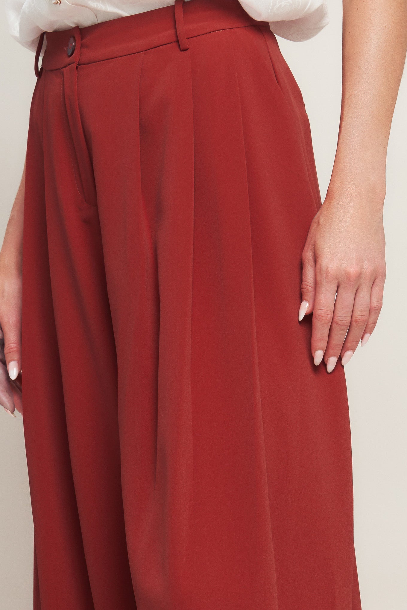 A solid woven pant featuring front closure, front pleats, side pockets and wide leg