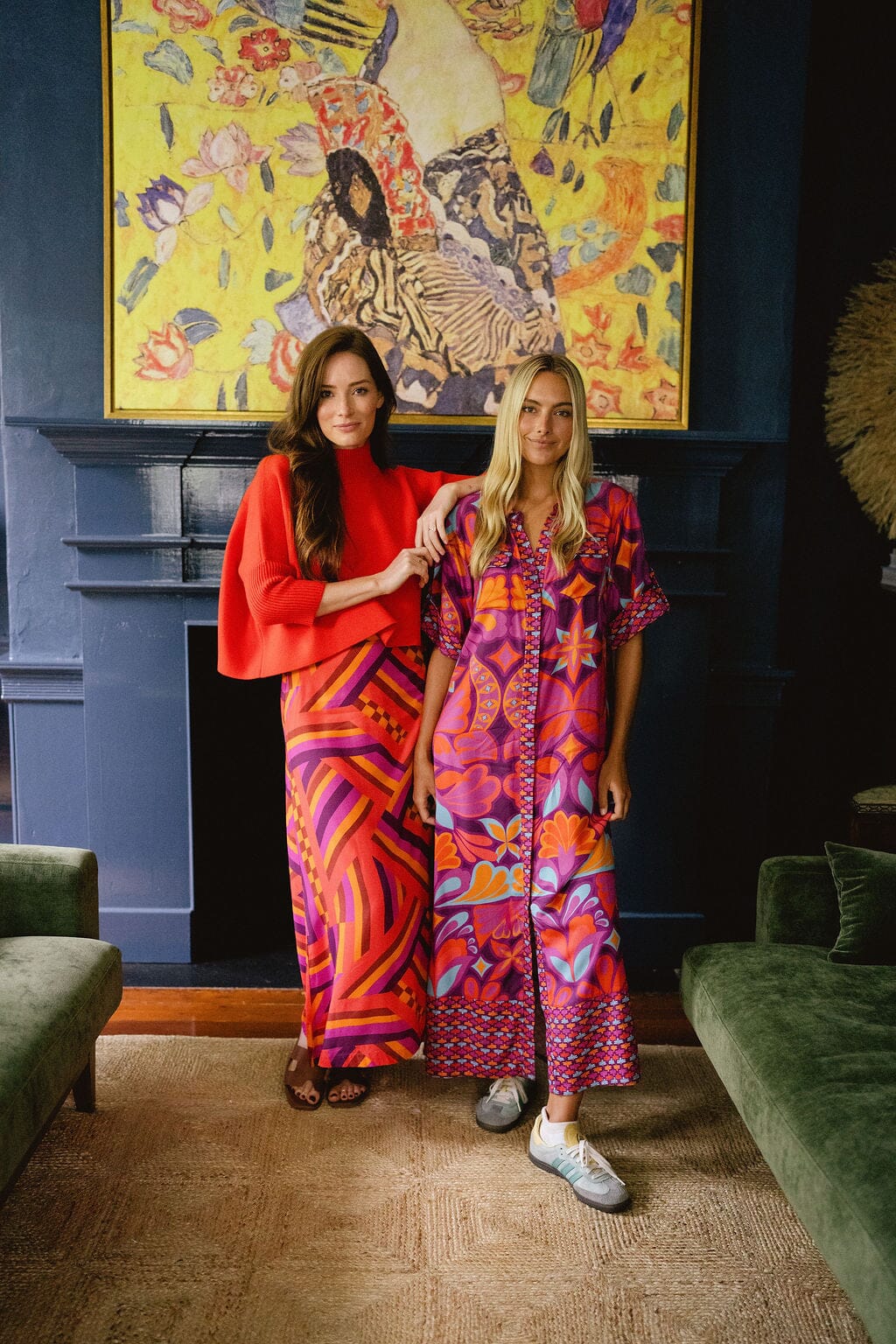 The Tiffany Skirt brings a playful splash of coral, orange, and purple in a chic geometric print. Its slimming fit and side zipper create a flattering silhouette, while the elastic back waist ensures comfort. Style it with our Sophia Sweater for an effortlessly fun and vibrant outfit perfect for any occasion.