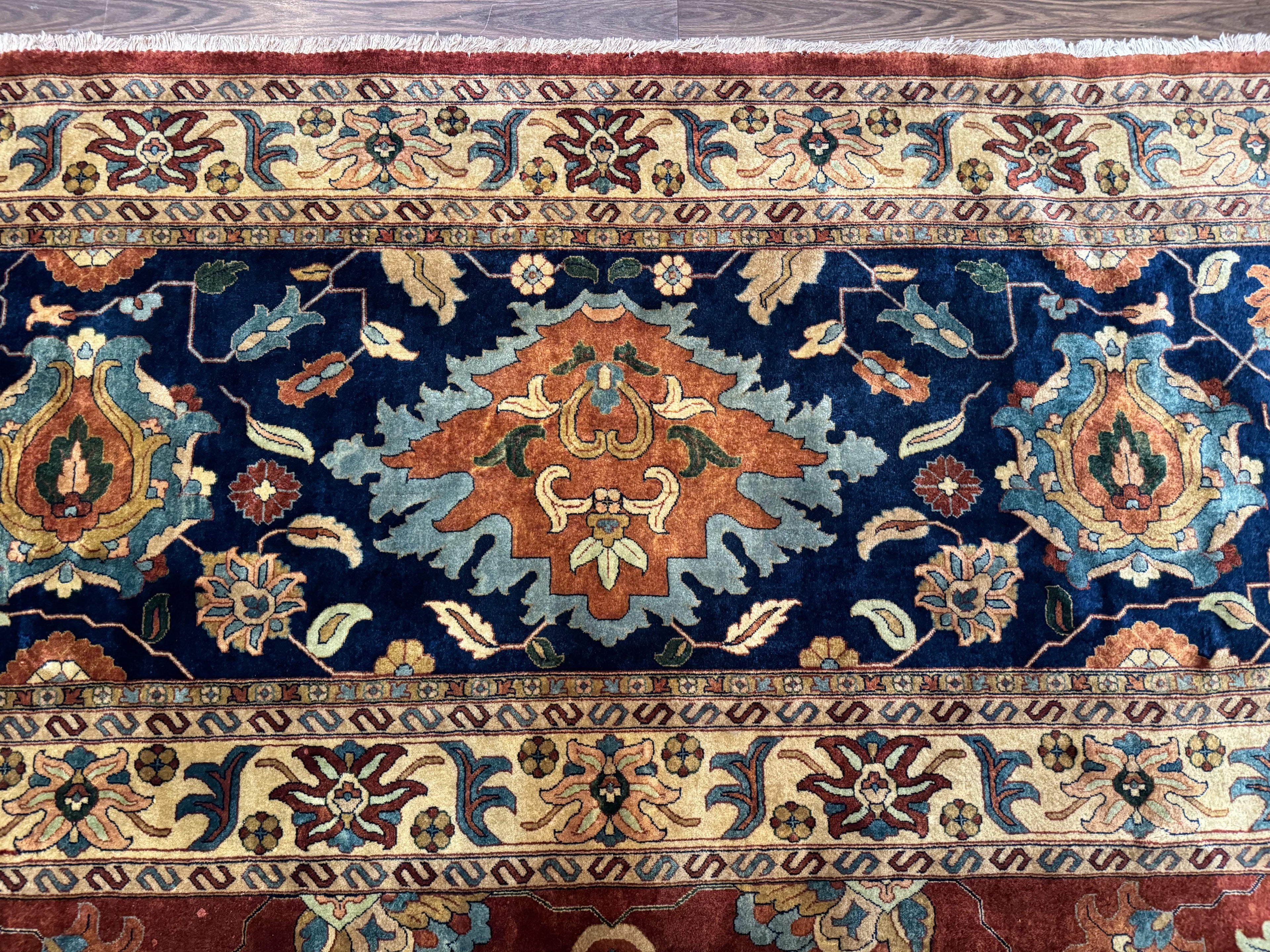 8x9.7 Blue Antique Style, Distressed Finish Hand Carved Traditional Medalian Hand Knotted Wool and Silk Rug