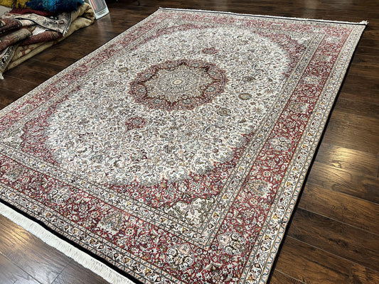 Silk Indian Kashmiri Rug 9 x 11 ft, Room Sized Silk Vintage Indo Persian Handmade Hand Knotted Fine Oriental Carpet, Ivory and Maroon