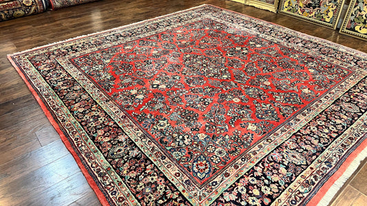 Square Persian Sarouk Rug 11x11 ft, Rare Size, Hand Knotted Wool Floral Allover Red Persian Carpet, Handmade Antique Rug