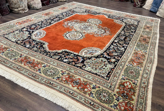 Indian Kashmiri Silk Rug 9x12, Vintage Rug 9 x 12 ft, Salmon Ivory Black Hand-Knotted Silk on Cotton Oriental Floral Carpet, Traditional Rug