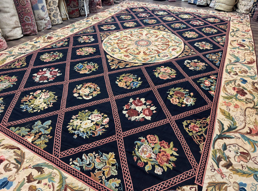 Palace Size Needlepoint Rug 12x20, European French English Aubusson Floral Design, Black and Beige