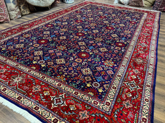 Indo Persian Rug 10x15, Floral Allover, Handmade Vintage Wool Carpet, Dark Blue Ivory Red, Palace Size Traditional Rug