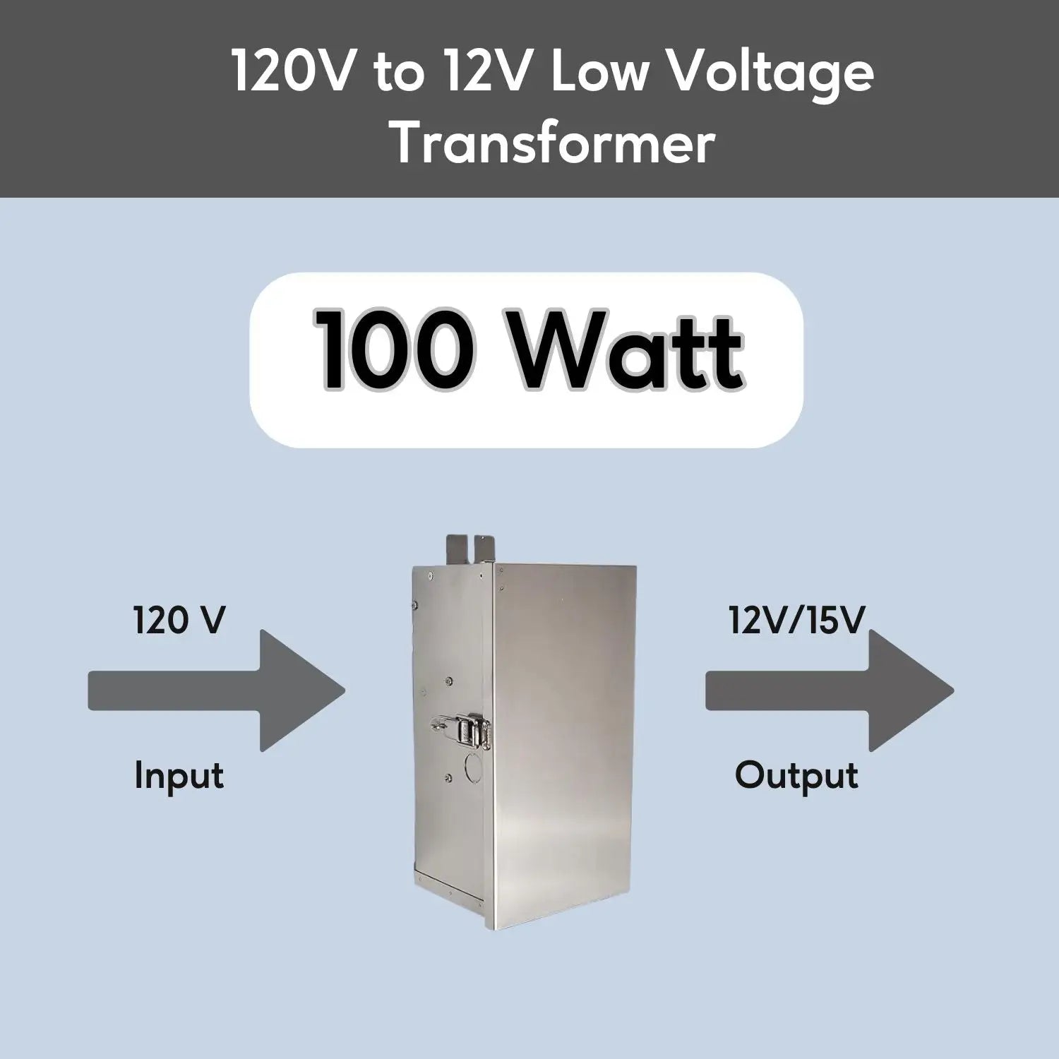 100 WATT MULTI-TAP LÅGSPÄNNINGSTRANSFORMATOR | 12 VOLT - 15 VOLT | RAM I ROSTFRITT STÅL FÖR INOMHUS- OCH UTOMHUSBRUK