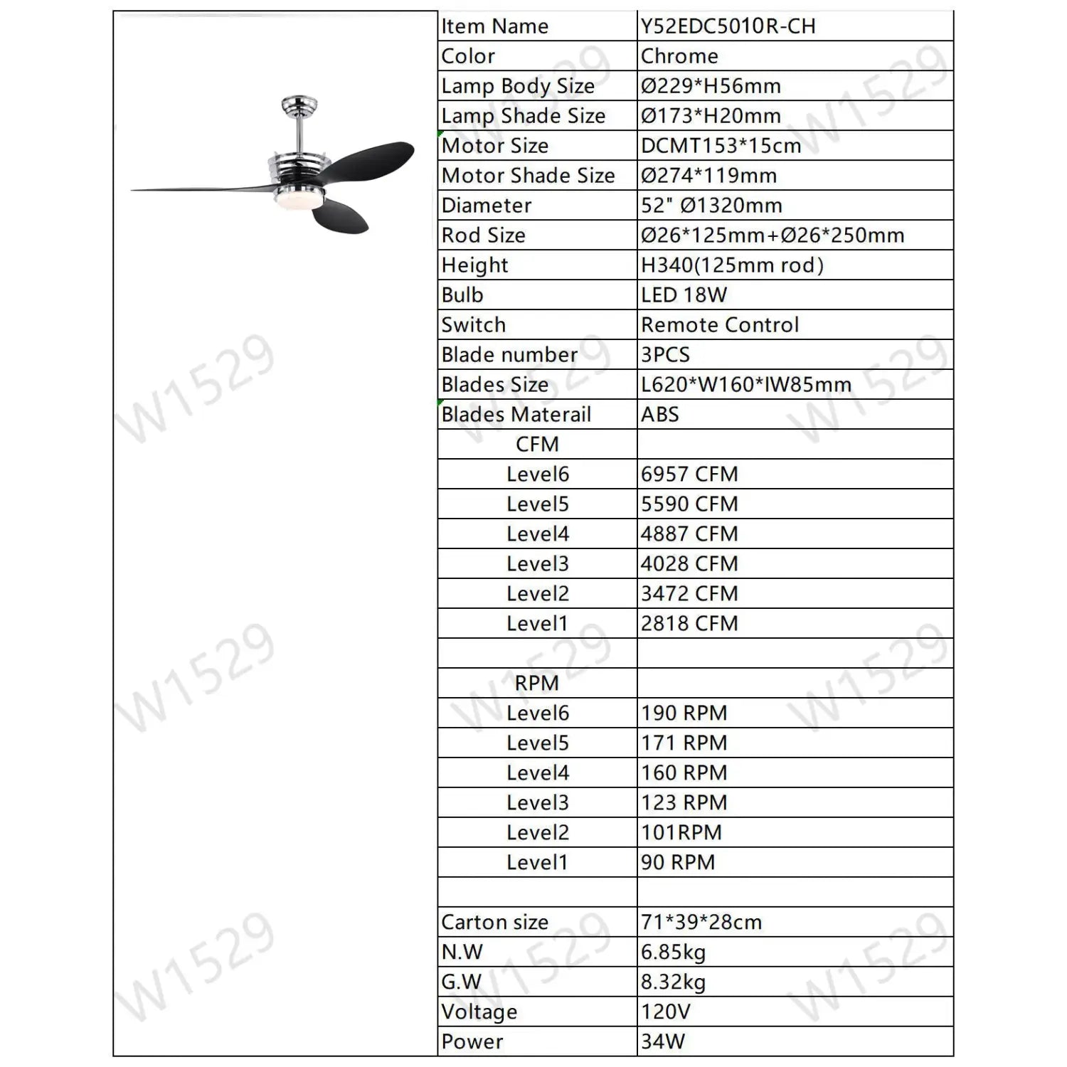 52" modern takfläkt med ljus, 3 ABS-blad, DC fjärrkontroll