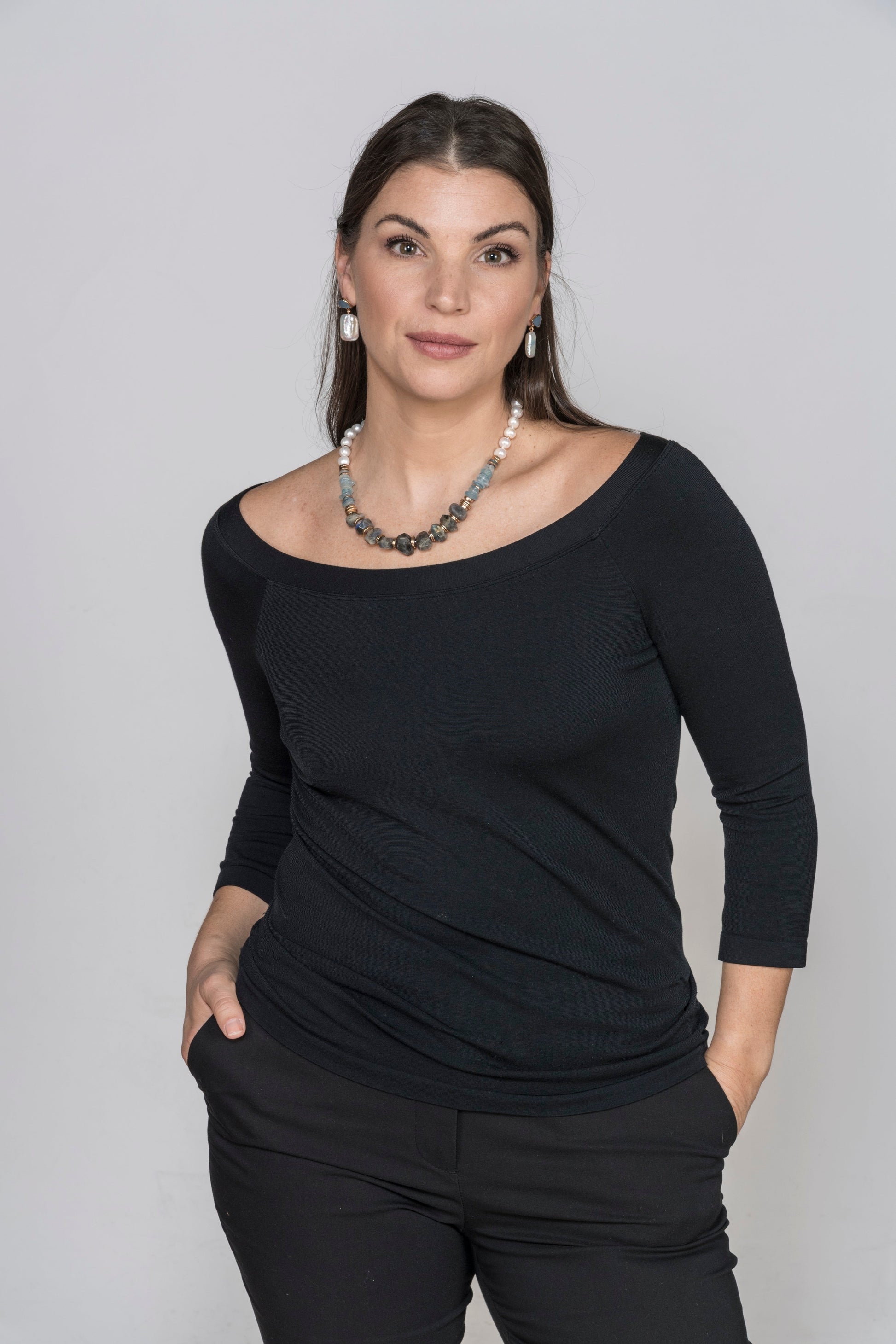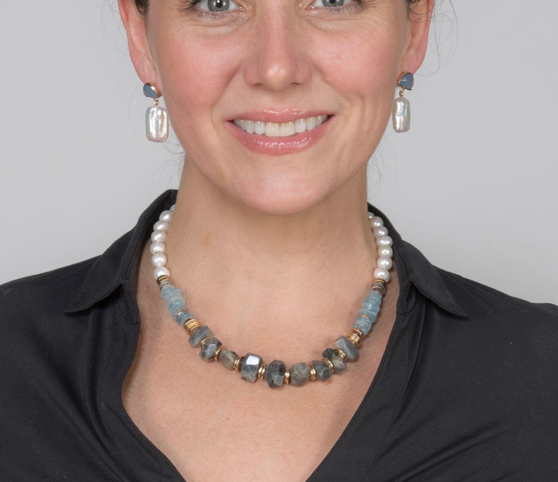 9-10mm Freshwater Pearls with natural Aquamarine and Labradorite Stones