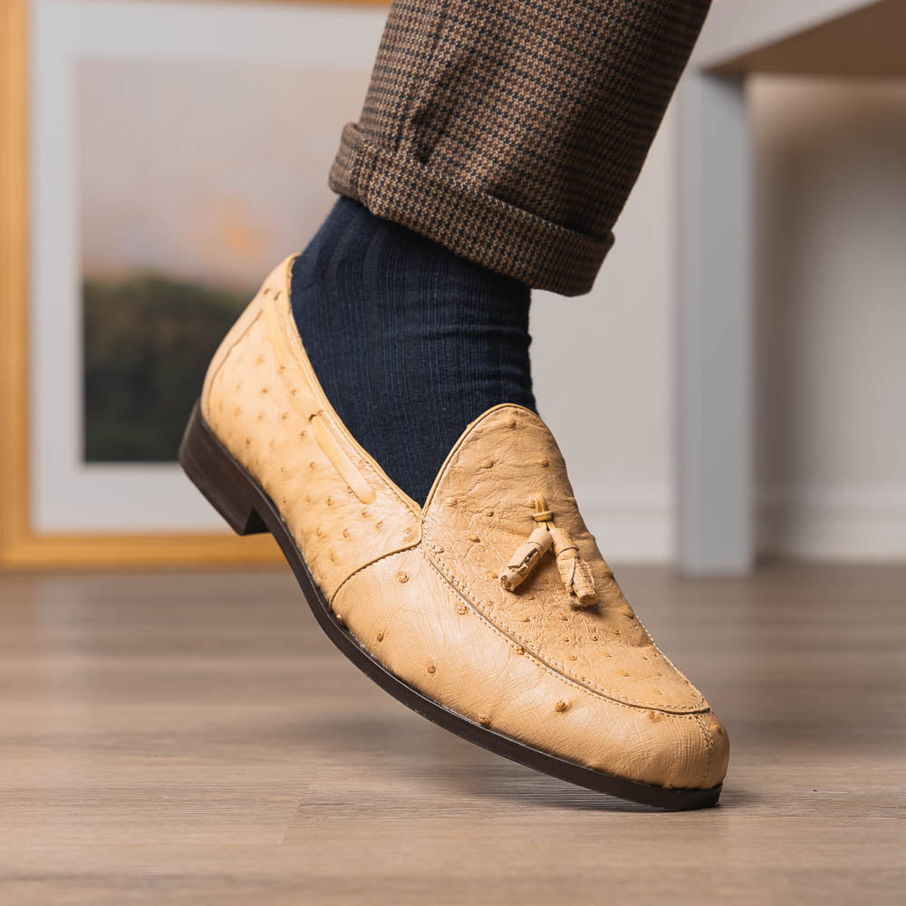 The AUBIERE is our classic fully genuine ostrich tassel loafers that have made their way as a best seller. They feature a beautiful polished hand finish, easy slip-on application, and a full leather outsole. Dress these up with your favorite jeans, slacks, or shorts for a sophisticated look.