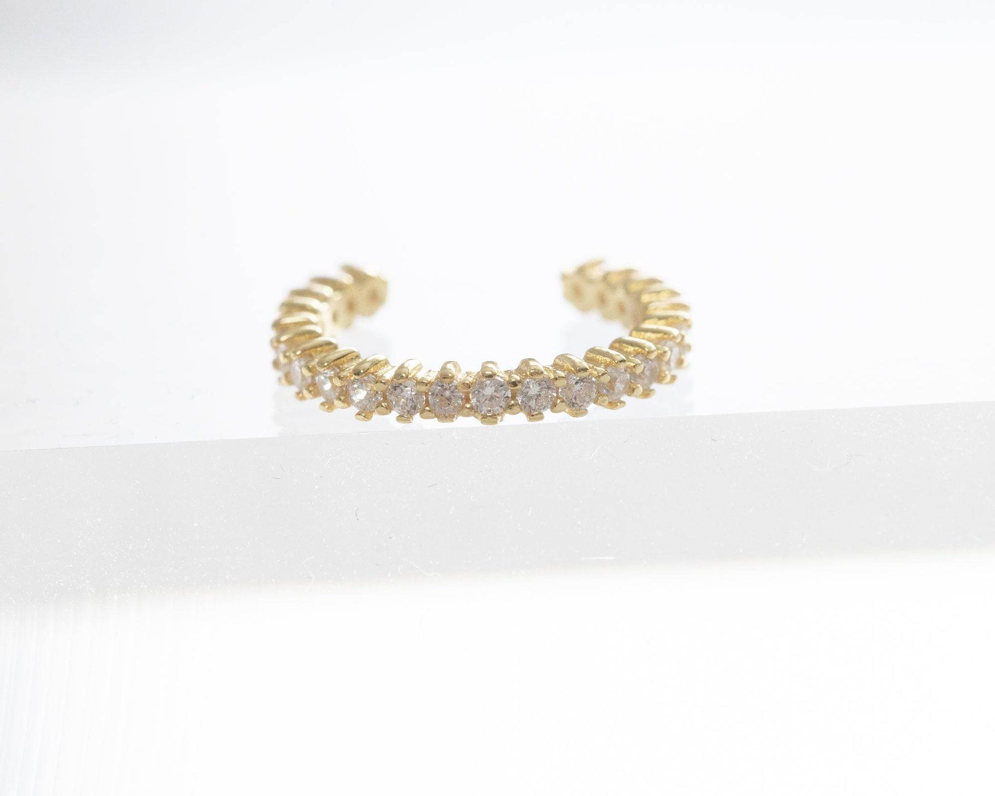 Uppgradera din öronfest med vår Crystal Ear Cuff. Tillverkad med 14k guld vermeil och gnistrande kristaller, glid den enkelt på den smalaste delen av ditt öra och justera för en unik look. Ingen piercing krävs!