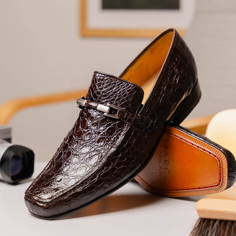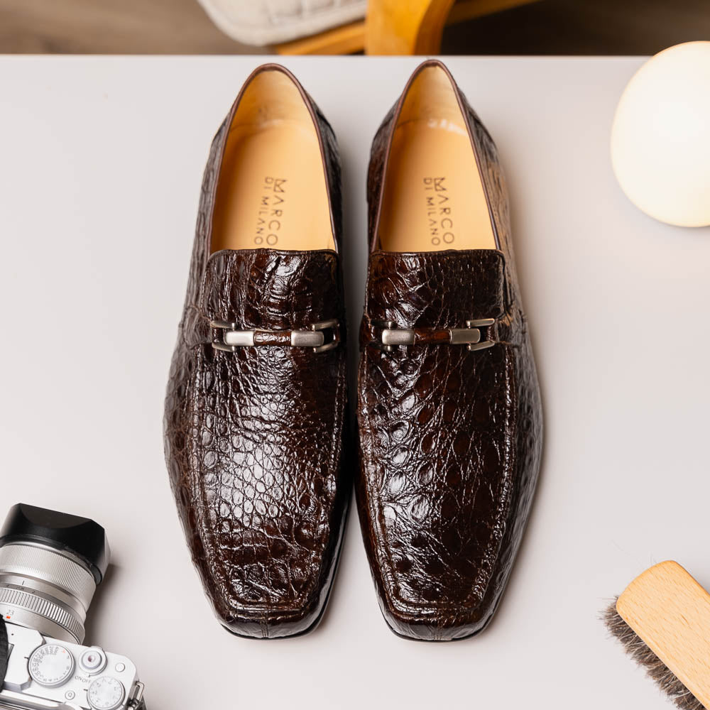 The FABRO is our stylish fully genuine alligator bit loafers sporting a silver tone metal bit, a beautiful polished hand finish, and durable and comfortable rubber outsole. Dress these up with your favorite jeans or slacks for a sophisticated look.