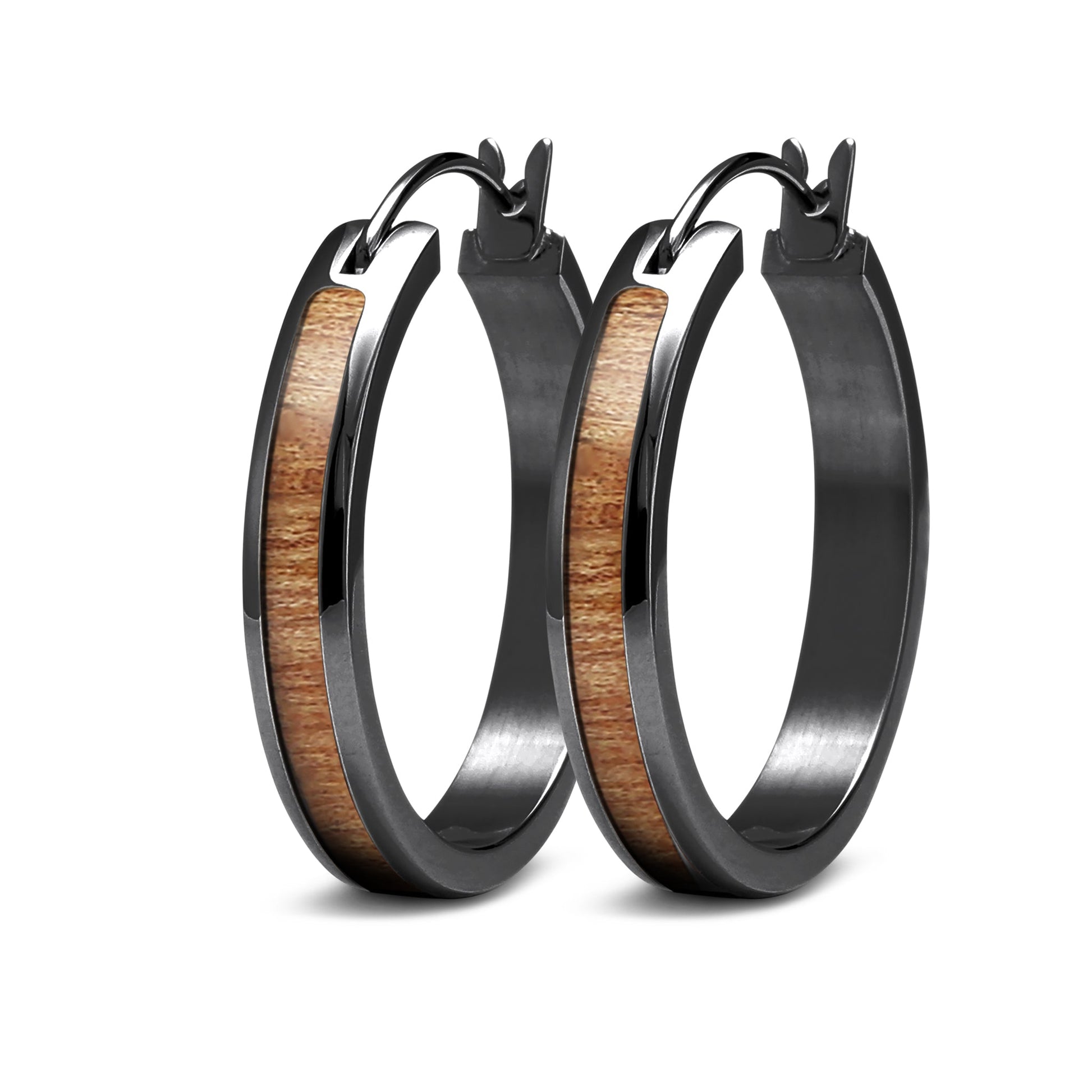 Australiensisk Gum Burl (Tasmanian Oak/Stringybark) infattad i en kirurgisk rostfri stålkrok med gunmetalplätering, 25 mm ringörhänge.