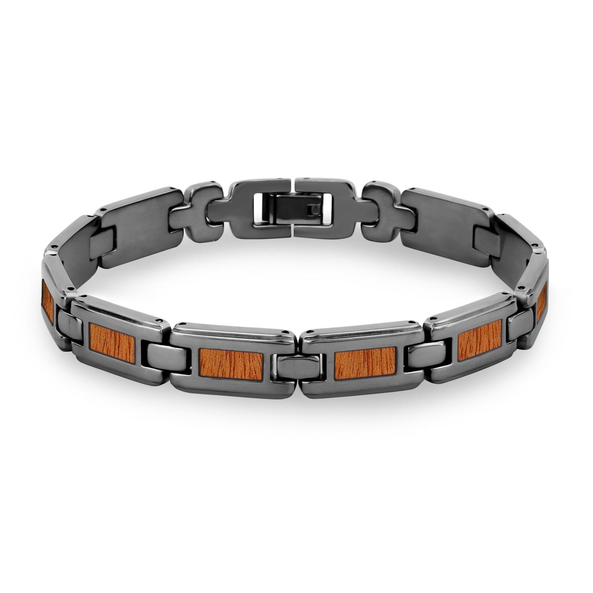Herrarmband i rostfritt stål med Gunmetal-plätering och inlägg av australiensisk Gum Burl (Tasmanian Oak/Stringybark). Länkar kan tas bort för att justera storleken.