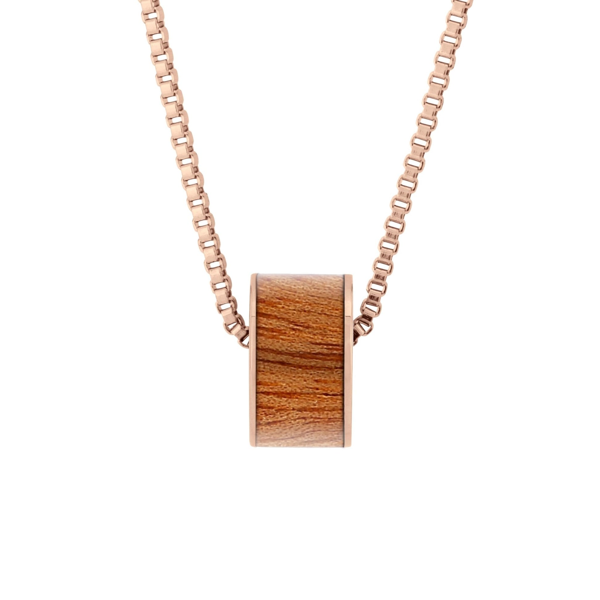 Roséguldspläterad rostfri stålpärla i tunnform med inläggning av ansvarsfullt anskaffat Gum Burl (Tasmanian Oak/Stringybark) trä. Tunnformad pärla passar även de flesta populära berlockarmband.