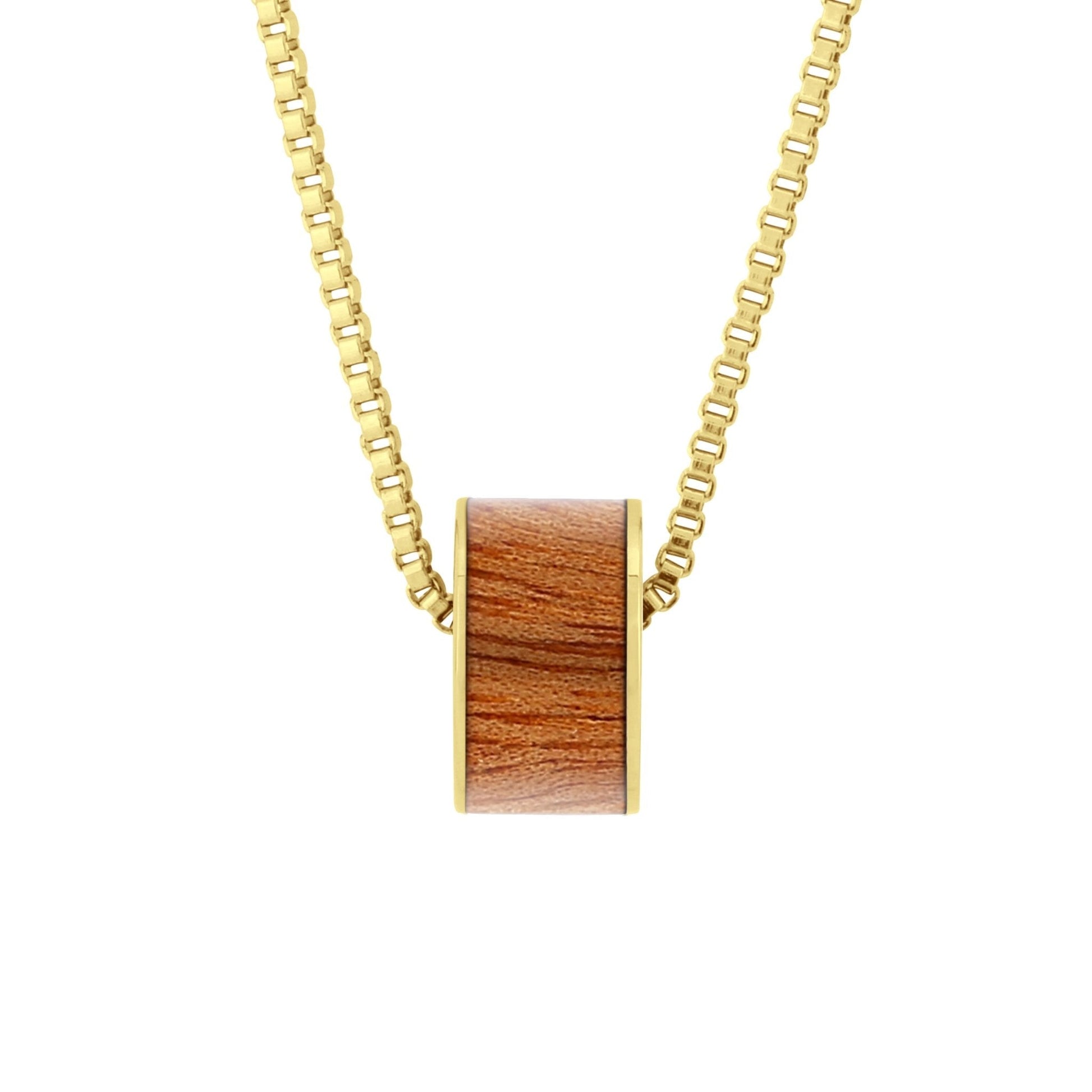Gult guldpläterat rostfritt stålfatspärlhänge infattat med ansvarsfullt inköpt Gum Burl (Tasmanian Oak/Stringybark) trä. Fatspärlan passar även de flesta populära berlockarmband.
