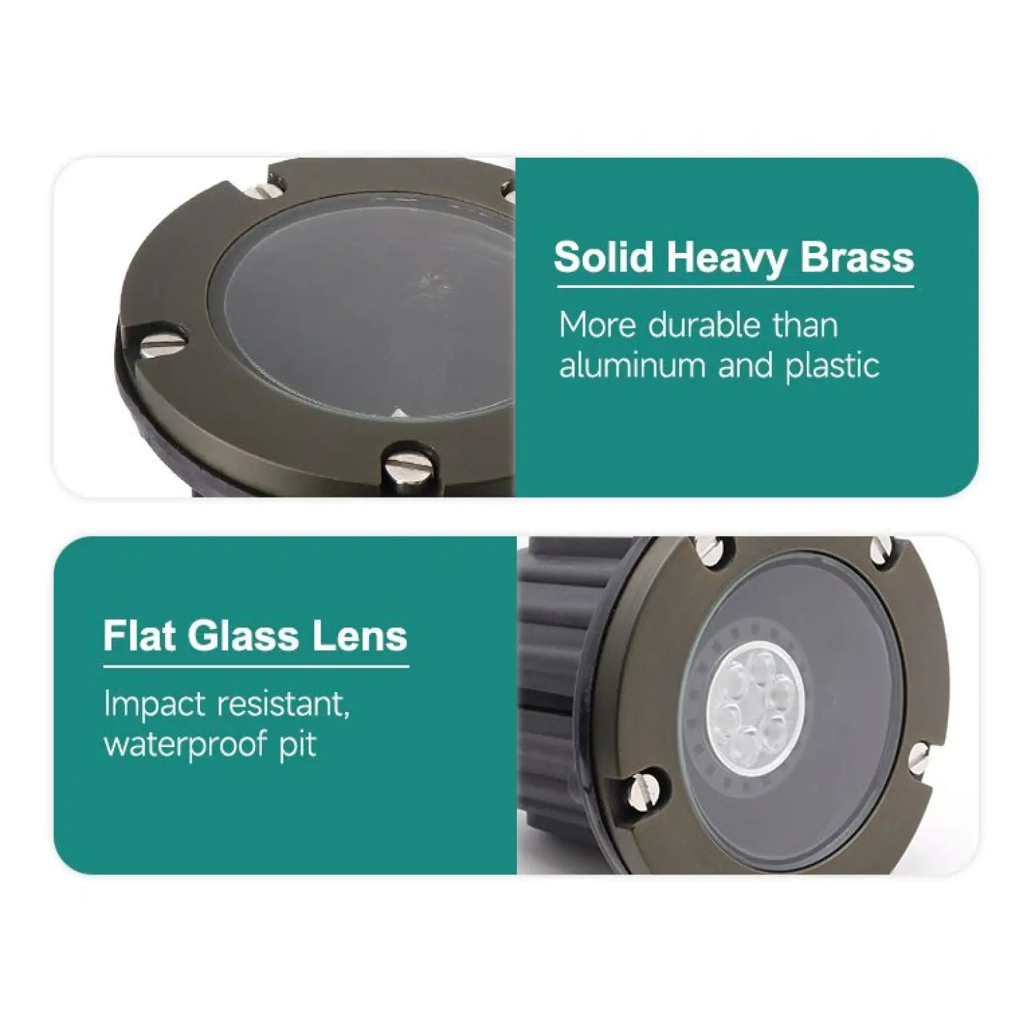 Brunnsbelysning för landskap med MR16-sockel, tillverkad av mässing och PVC för utomhusinstallation och landskapsbelysning.