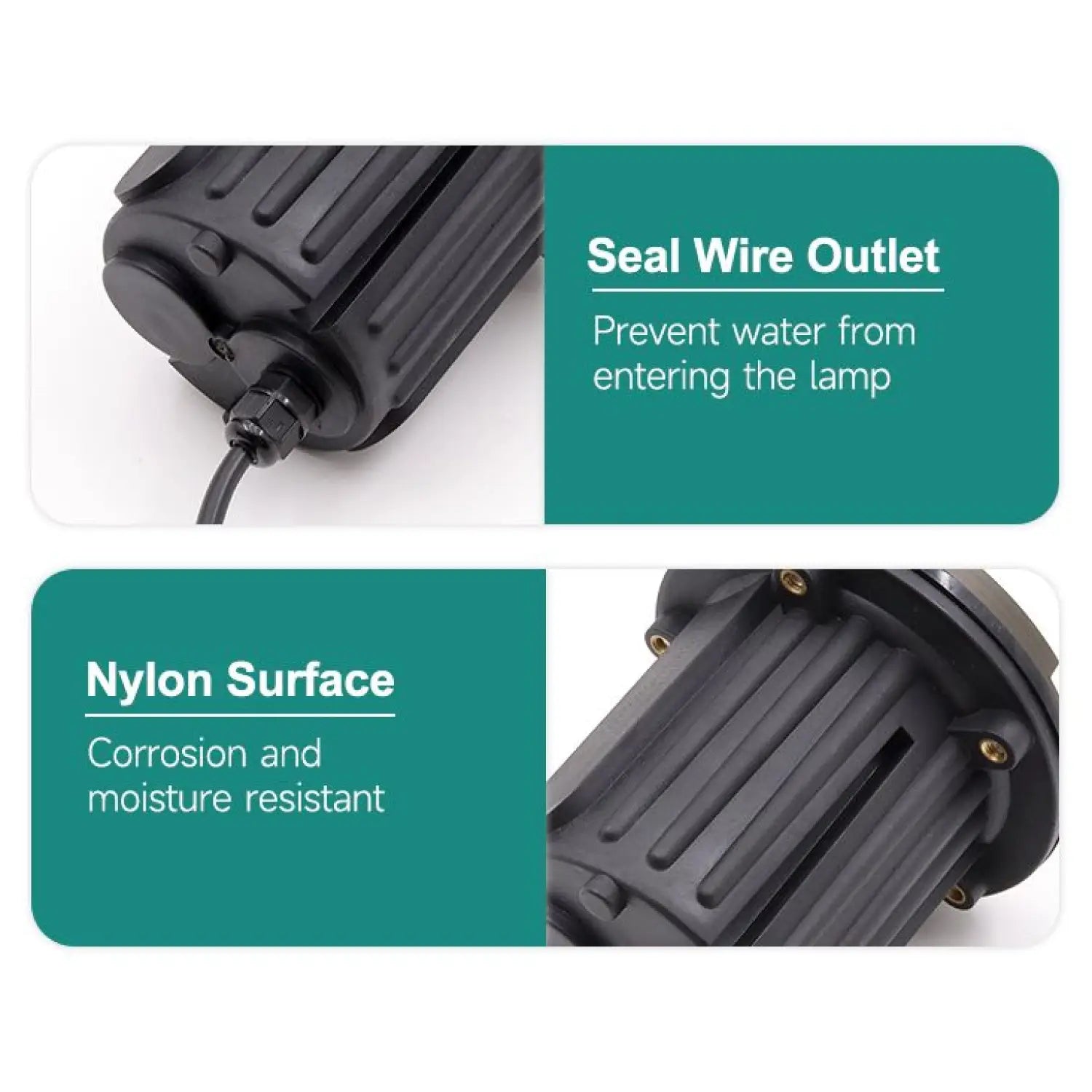 Brunnsbelysning för landskap gjord av mässing och PVC, designad för användning med MR16-lampor och lämplig för utomhusbelysning.