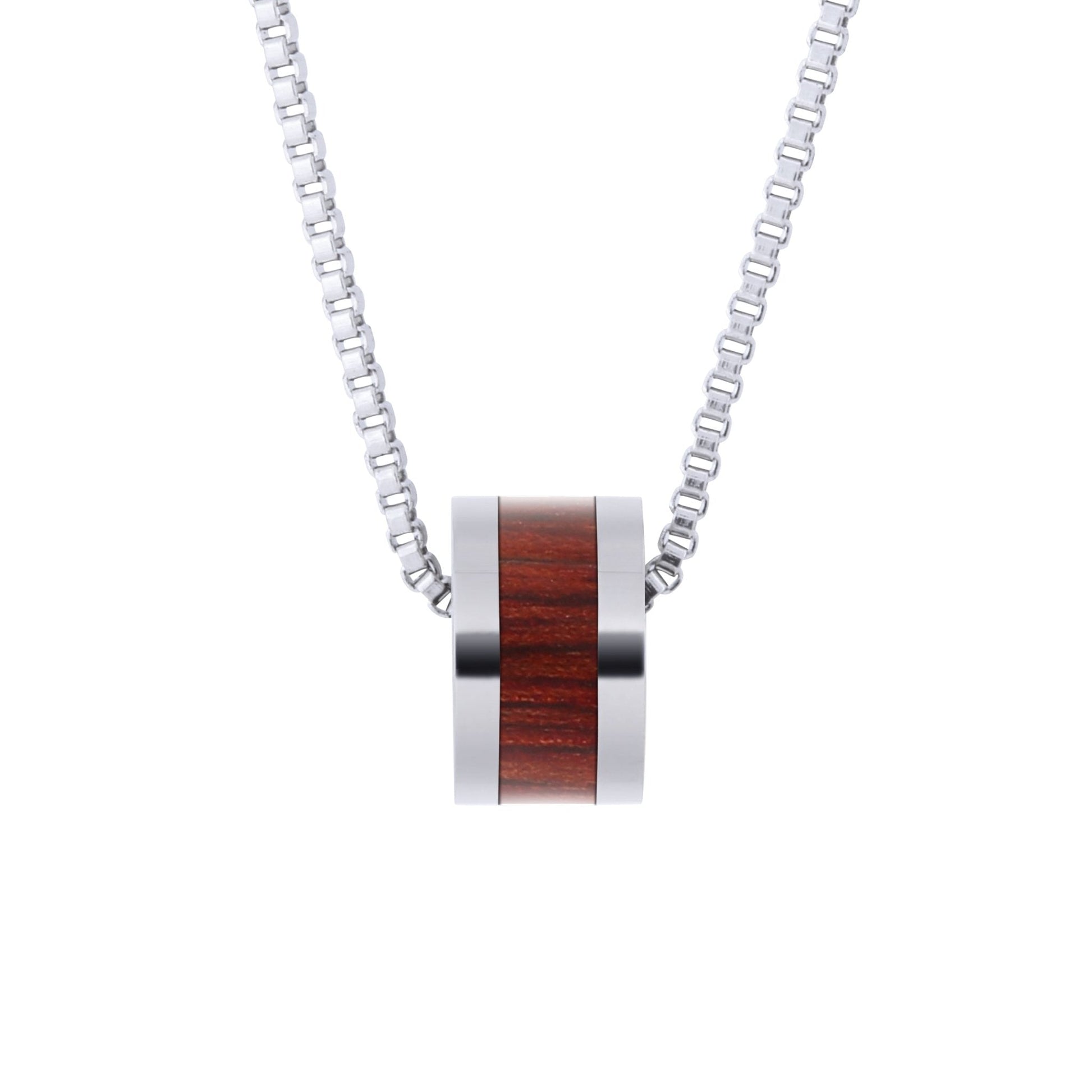 Hängsmycke med pärla i rostfritt stål och fat inlagt med ansvarsfullt anskaffat Jarrah-trä från sydvästra Australien.