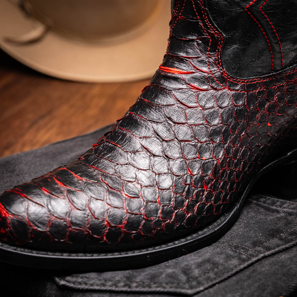 The KANSAS boot is a bold expression of authentic Western heritage elevated by luxury craftsmanship. Expertly handcrafted using genuine Python skin for the vamp and rich full-grain leather on the shaft, this piece delivers timeless cowboy attitude with a refined and modern edge. The contrast stitching and signature red interior lining add a distinctive flair—designed to turn heads whether you're on the ranch or the city streets.