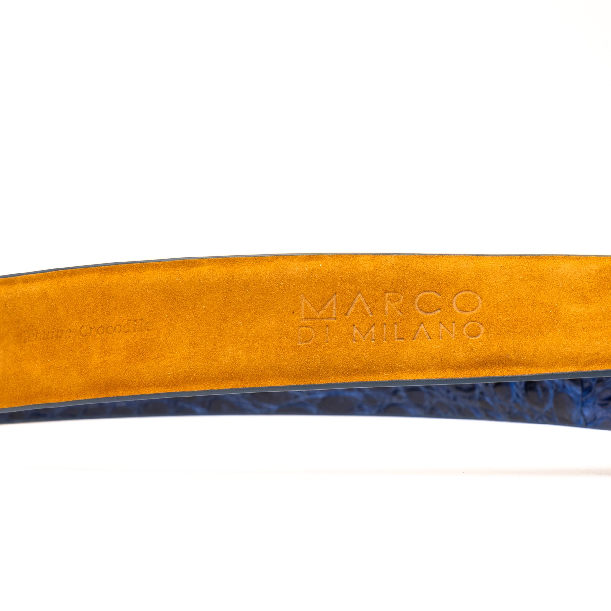 Finish your look with our genuine exotic caiman flank belts, featuring beautiful antiqued hand-finishes and soft interior lining. The brushed chrome buckle features subtle Marco Di Milano branding, and it easily removable in case you need your belt trimmed to size.