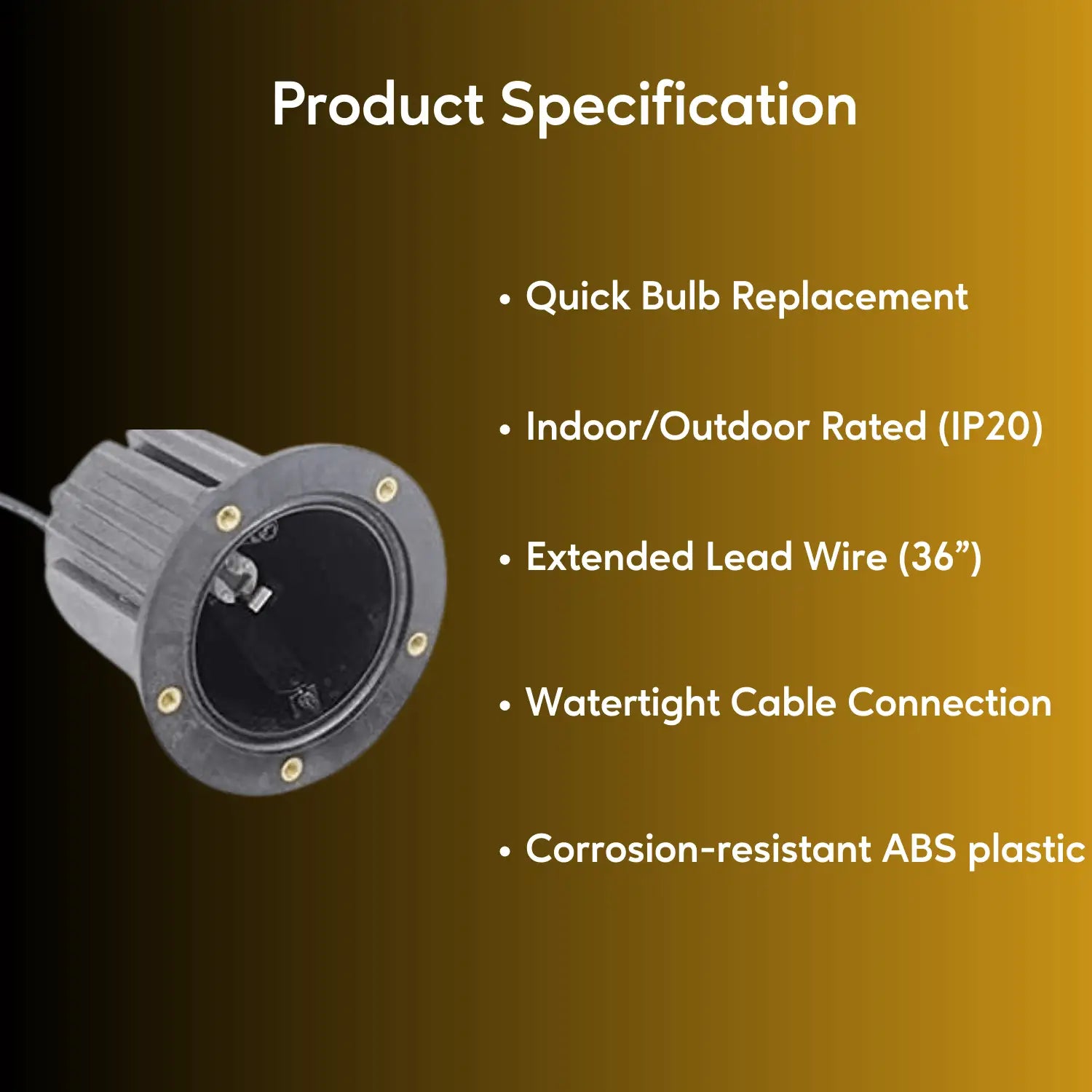 Tillverkad för hållbarhet och estetik, är denna markbelysning designad för att förbättra atmosfären i din omgivning. Med ett solid mässingslock, lågspännings bi-pin MR-16-sockel och vattentät dragavlastning erbjuder denna utomhusbelysning både funktionalitet och elegans.
