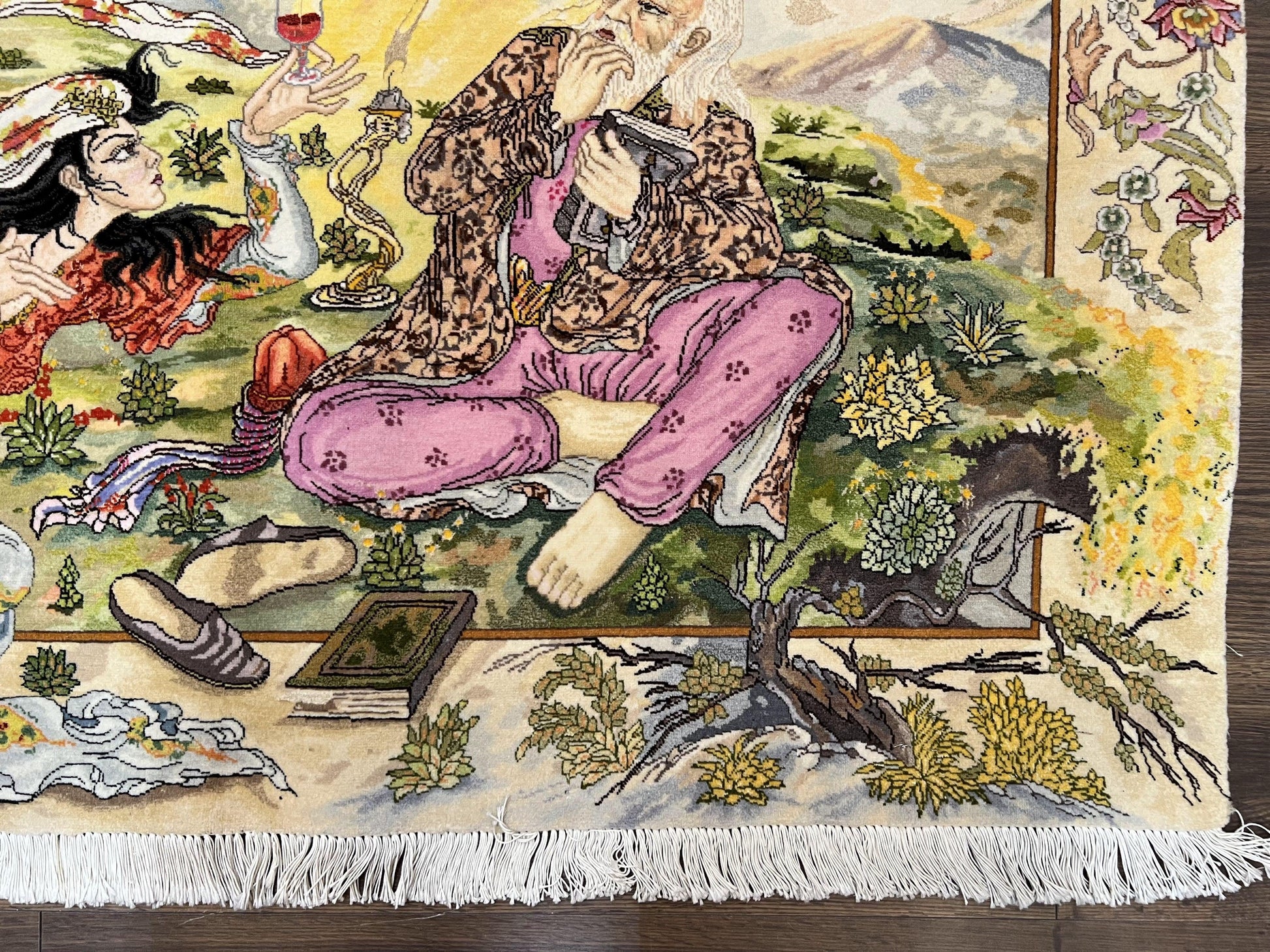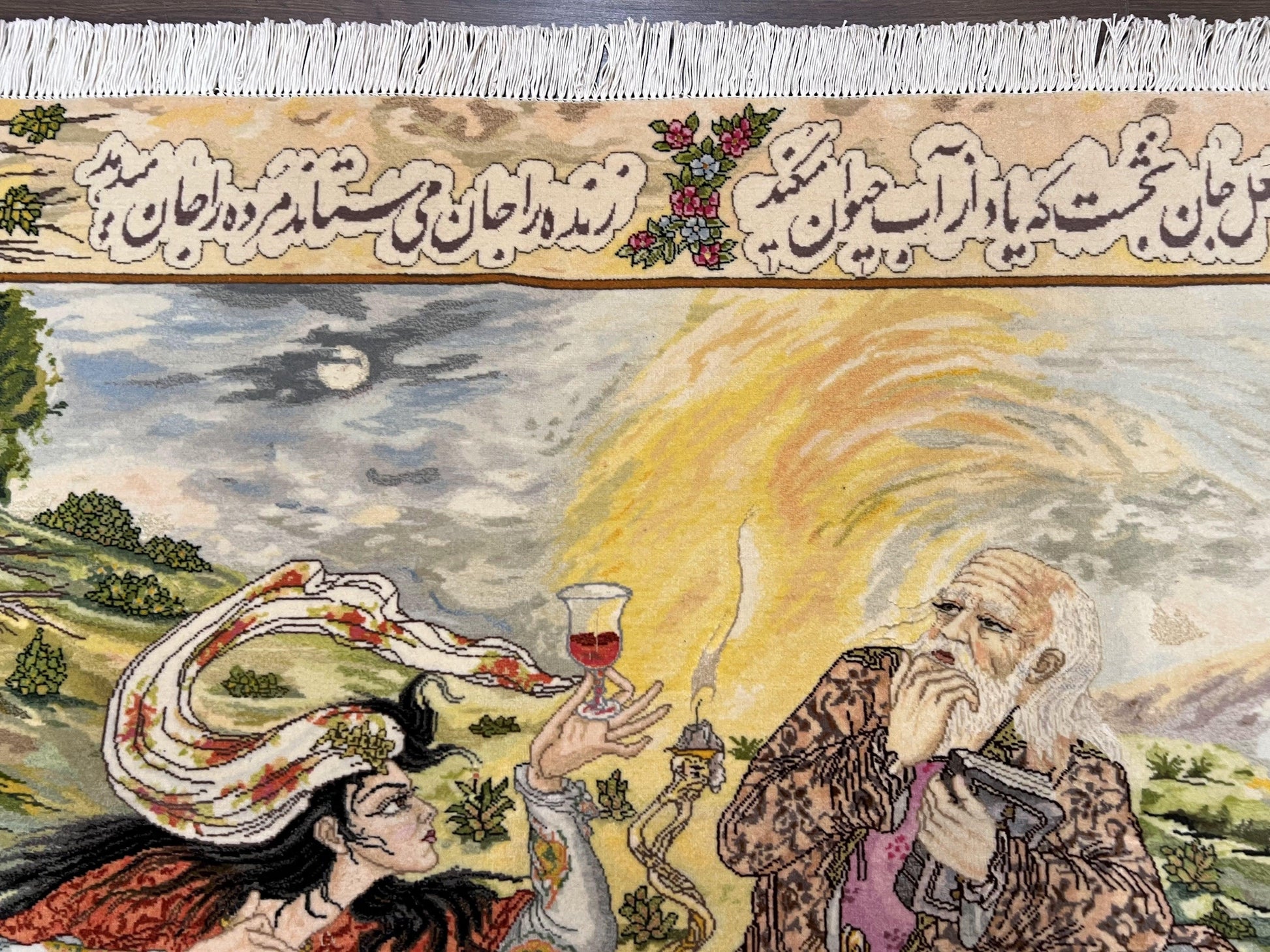 Persian Tabriz Pictorial Rug 5x3, Hafez Poetry In Border, Very Fine Hand Knotted Carpet, Wall Hanging Wool Oriental Carpet 3x5, Highly Detailed