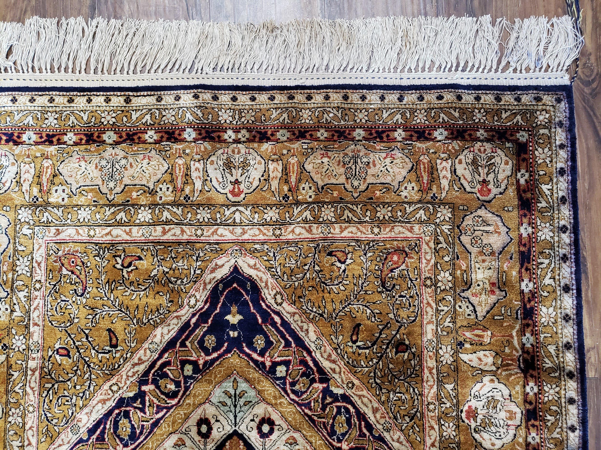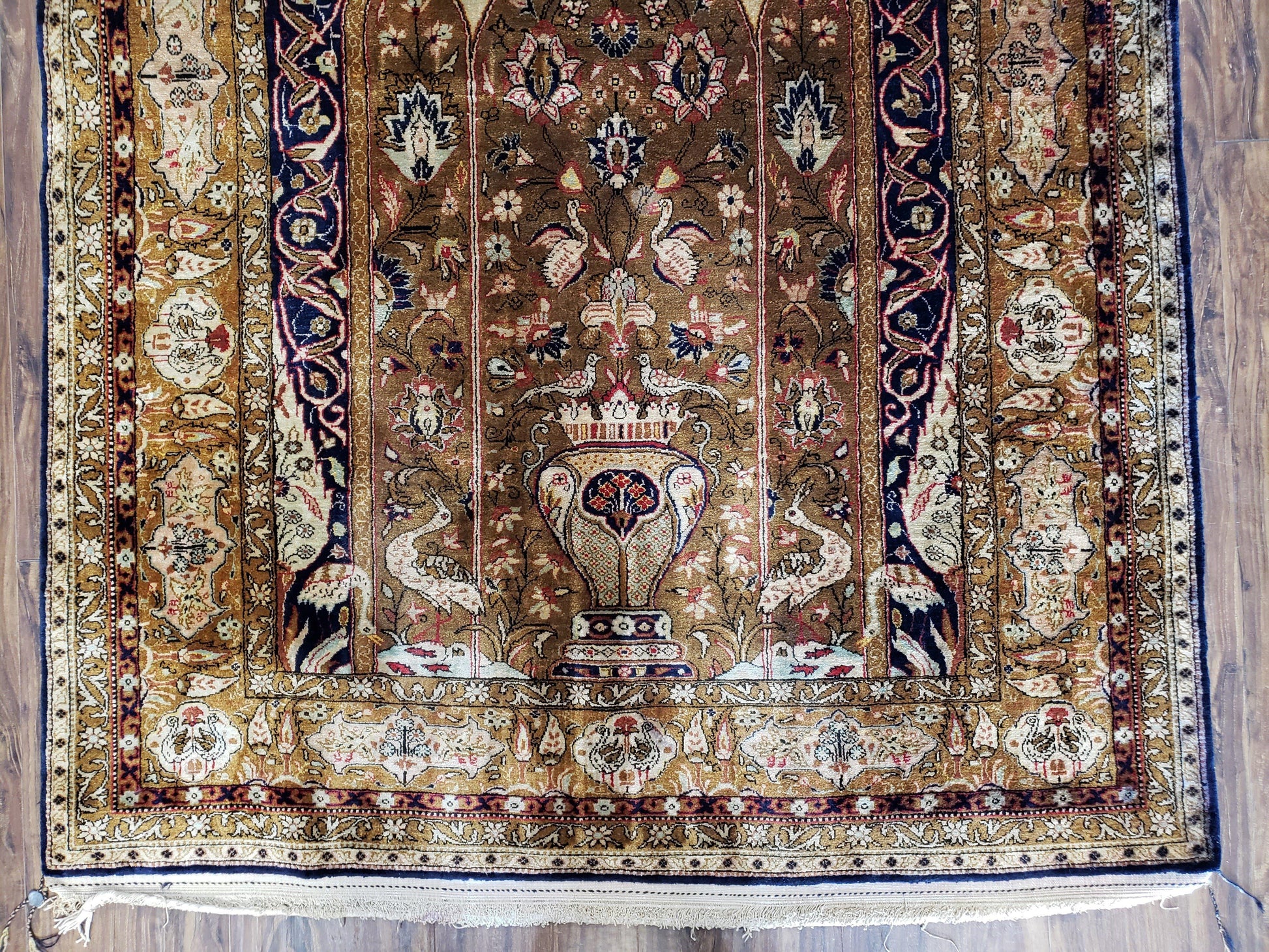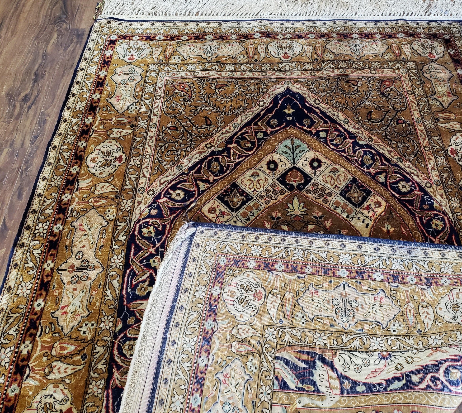 | Condition/Notes | A beautiful vintage authentic silk prayer rug in good condition. Free of stains, odors, tears, etc. Good pile & fringes. Recently cleaned and ready to be enjoyed in your space. |